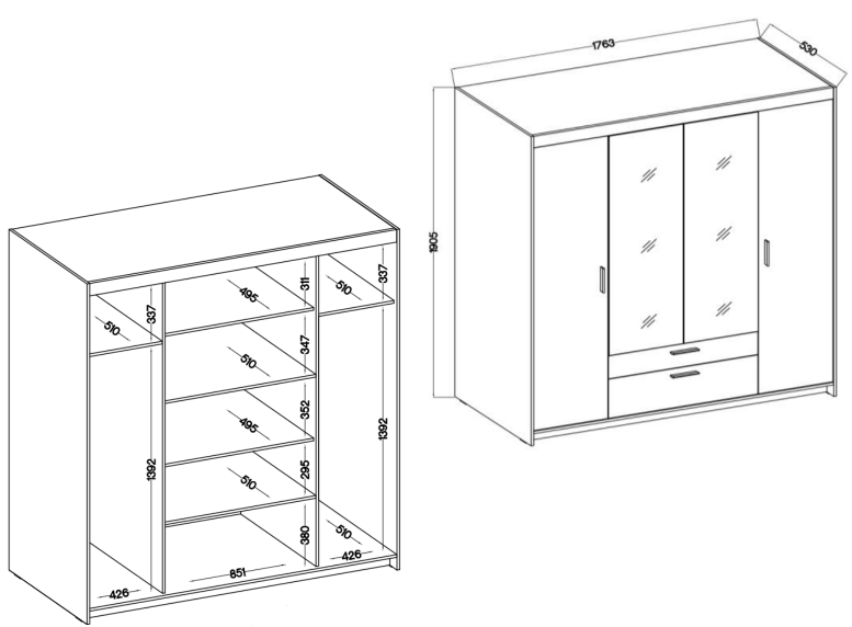 - Szafa w środku: zawiera 6 półek oraz 2 drążki na wieszaki