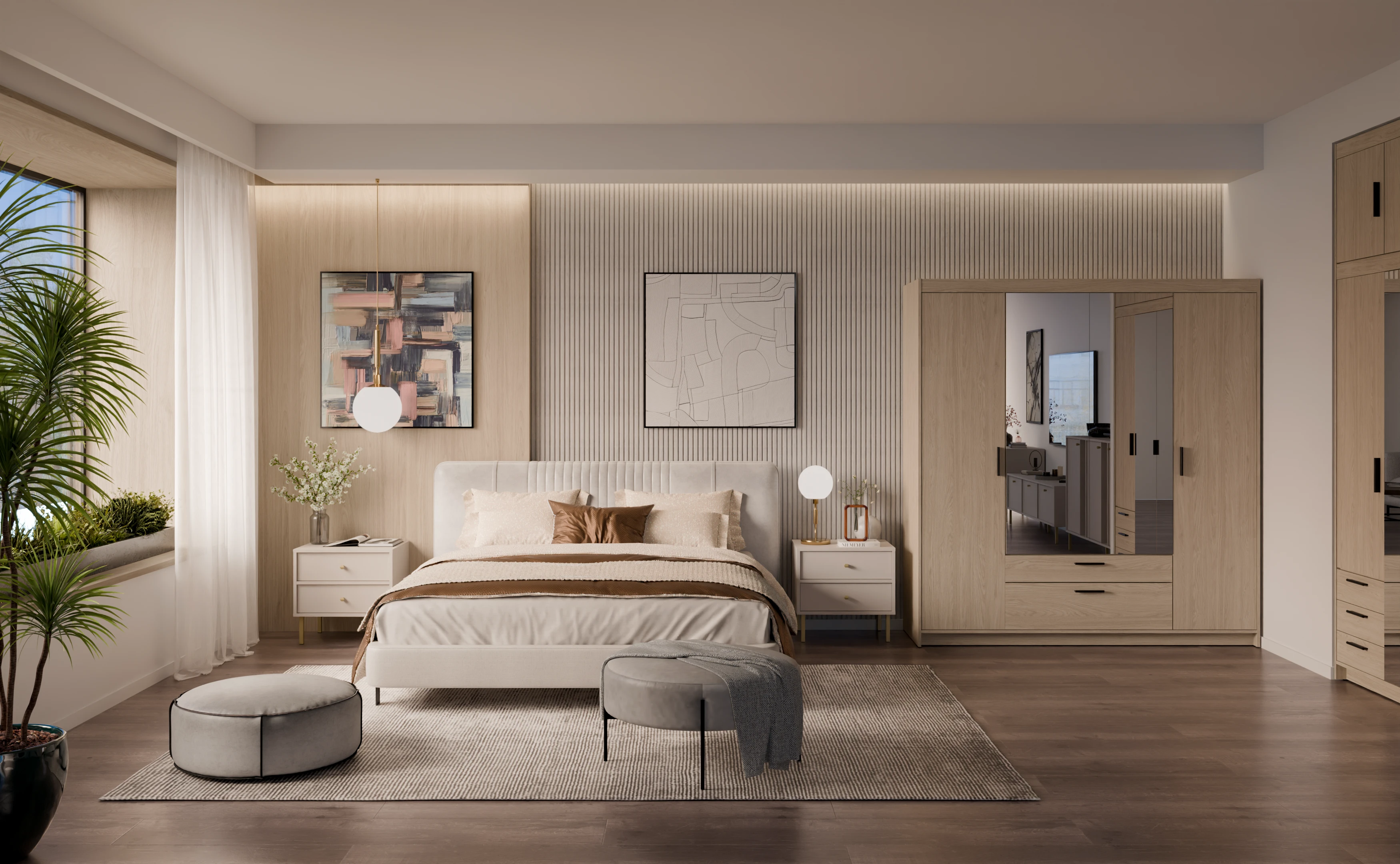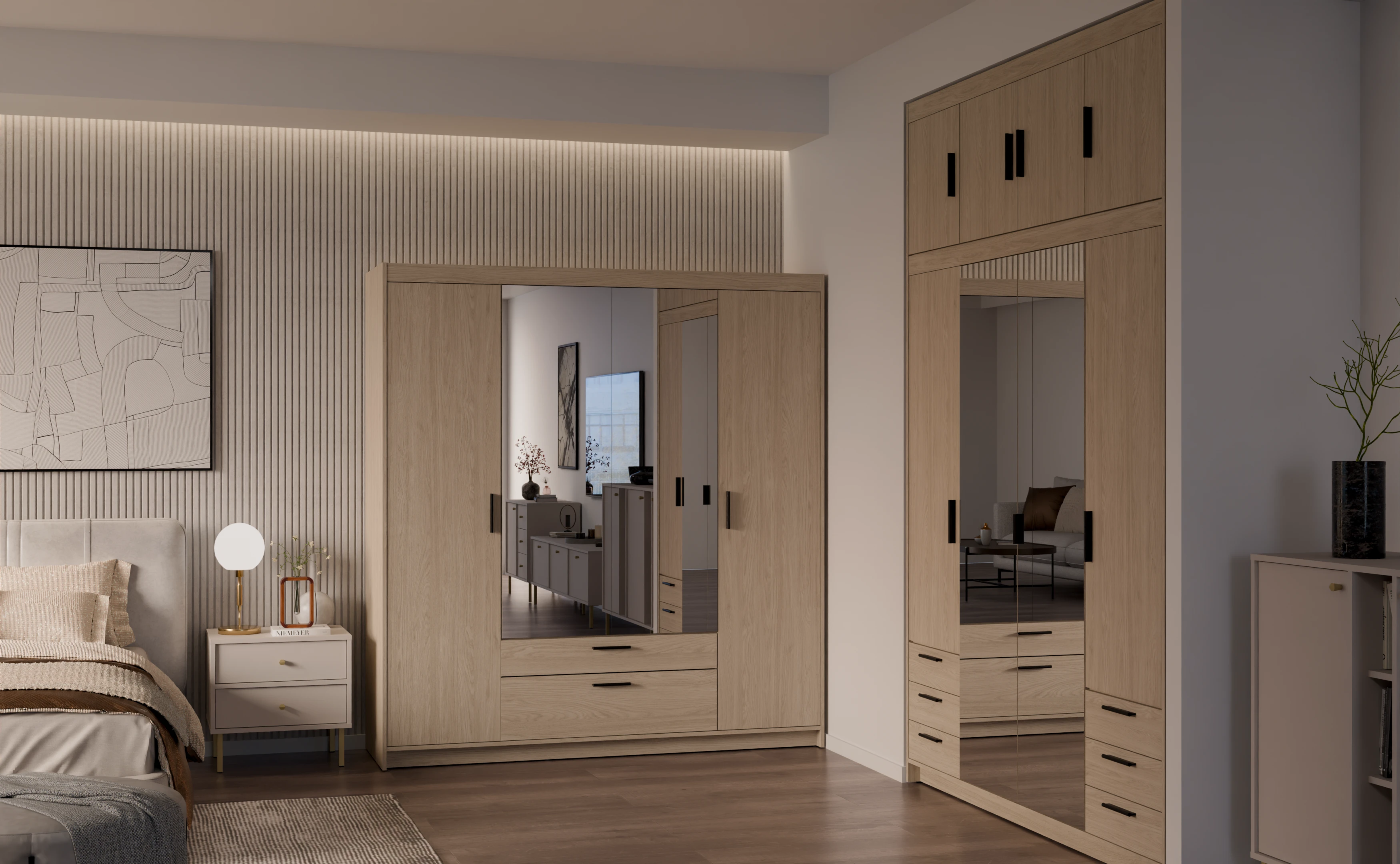 Oczywiście — takie właśnie są szafy z kolekcji KLEO. Zaprojektowana z myślą o nowoczesnych wnętrzach i realnych potrzebach użytkowników, oferuje szeroki wybór wariantów: od kompaktowej szafy jednodrzwiowej, przez modele dwu-, trzy- i czterodrzwiowe, aż po funkcjonalną szafę narożną. Dostępność wersji z lustrem lub bez pozwala jeszcze lepiej dopasować mebel do charakteru pomieszczenia. Kolekcja występuje w starannie dobranej palecie kolorów — bieli, beżu piaskowego, dębie lefkas, dębie olejowanym oraz dębie sonoma — dzięki czemu z łatwością wpisuje się zarówno w jasne, minimalistyczne aranżacje, jak i bardziej przytulne, naturalne przestrzenie.