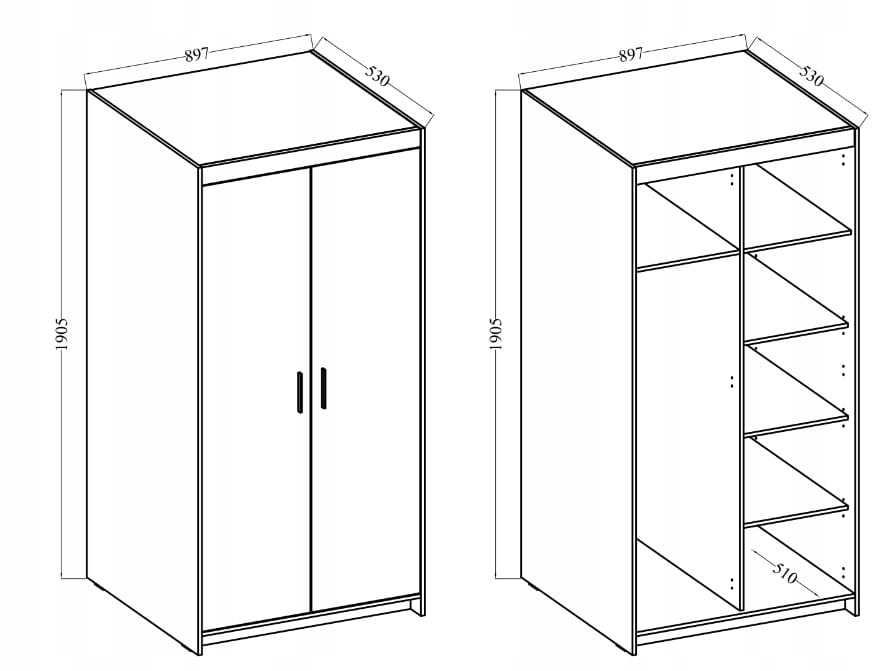 - Szafka w środku zawiera 5 półek oraz drążek na wieszaki
