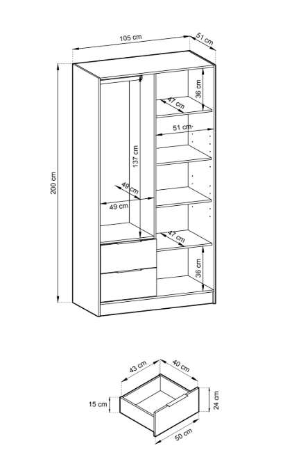 - Szafa zawiera pojemne półki oraz drążek na wieszaki