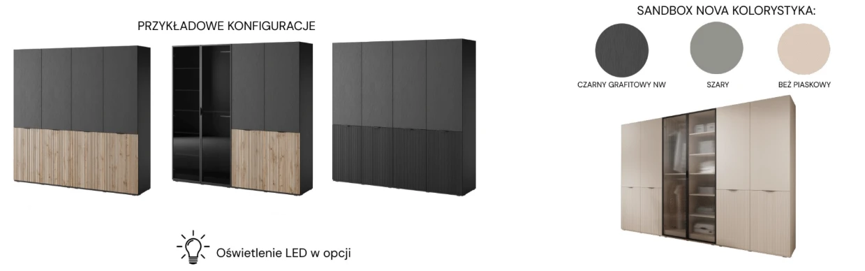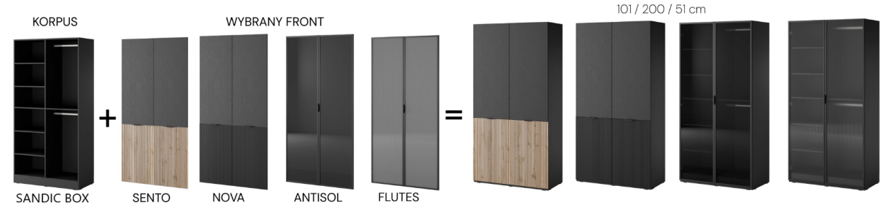 Szafa dostępna jest w trzech uniwersalnych kolorach korpusu: beż piaskowy czarny grafitowy szary Całość możesz uzupełnić o fronty dopasowane do charakteru wnętrza: Sento – elegancka prostota z nutą ciepła Nova – minimalistyczna forma idealna do nowoczesnych przestrzeni Antisol – częściowo przeszklony front, który dodaje lekkości i nowoczesnego wyrazu Flutes – częściowo przeszklony front z dekoracyjną strukturą, przyciągający wzrok i nadający wnętrzu charakteru Fronty Antisol i Flutes to idealny wybór dla osób, które chcą połączyć funkcjonalność z efektownym detalem wizualnym.