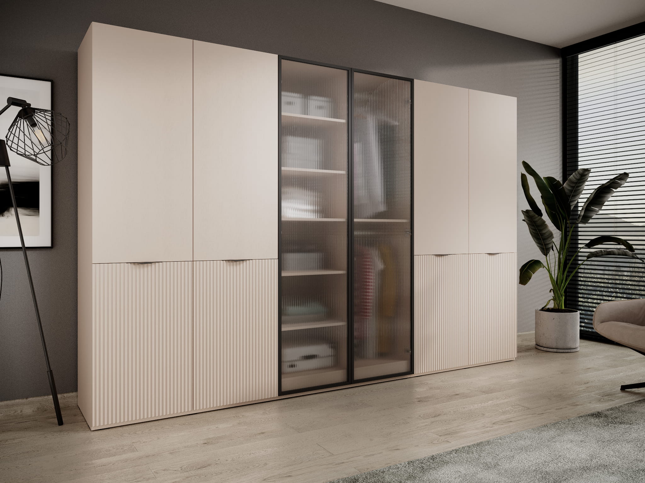 Szafa dostępna jest w trzech uniwersalnych kolorach korpusu: beż piaskowy czarny grafitowy szary Całość możesz uzupełnić o fronty dopasowane do charakteru wnętrza: Sento – elegancka prostota z nutą ciepła Nova – minimalistyczna forma idealna do nowoczesnych przestrzeni Antisol – częściowo przeszklony front, który dodaje lekkości i nowoczesnego wyrazu Flutes – częściowo przeszklony front z dekoracyjną strukturą, przyciągający wzrok i nadający wnętrzu charakteru Fronty Antisol i Flutes to idealny wybór dla osób, które chcą połączyć funkcjonalność z efektownym detalem wizualnym.