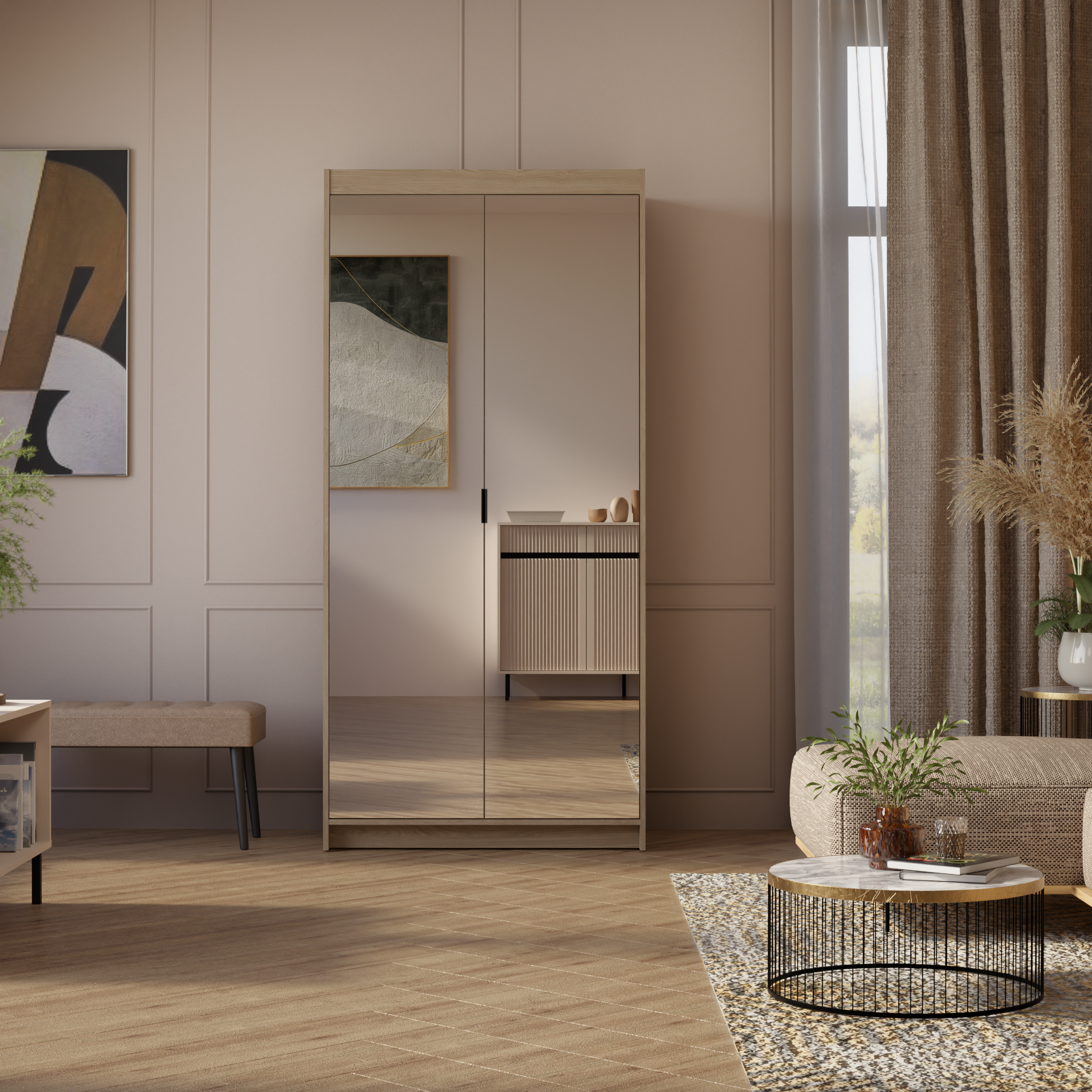 Oczywiście — takie właśnie są szafy z kolekcji KLEO. Zaprojektowana z myślą o nowoczesnych wnętrzach i realnych potrzebach użytkowników, oferuje szeroki wybór wariantów: od kompaktowej szafy jednodrzwiowej, przez modele dwu-, trzy- i czterodrzwiowe, aż po funkcjonalną szafę narożną. Dostępność wersji z lustrem lub bez pozwala jeszcze lepiej dopasować mebel do charakteru pomieszczenia. Kolekcja występuje w starannie dobranej palecie kolorów — bieli, beżu piaskowego, dębie lefkas, dębie olejowanym oraz dębie sonoma — dzięki czemu z łatwością wpisuje się zarówno w jasne, minimalistyczne aranżacje, jak i bardziej przytulne, naturalne przestrzenie.
