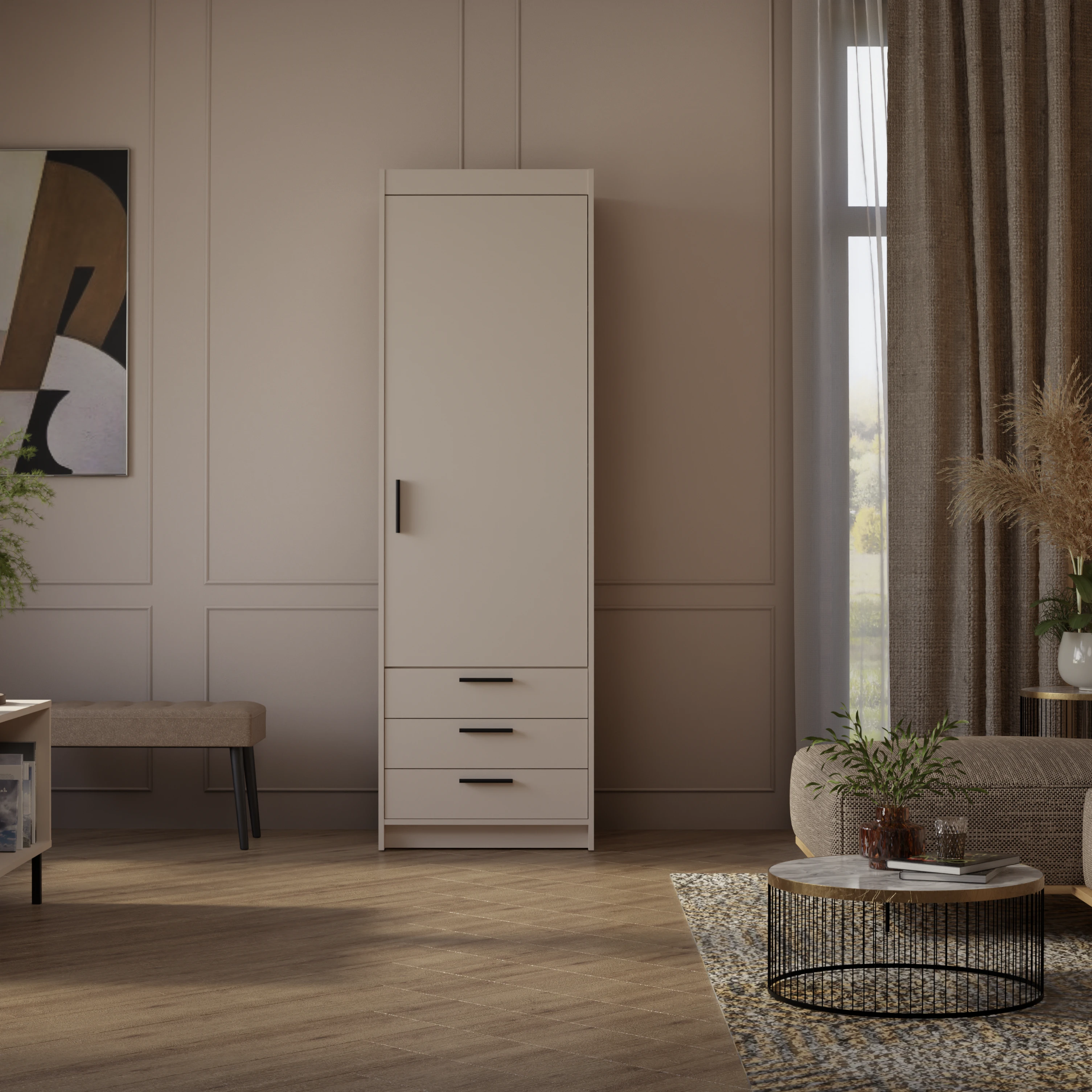 Szafa Jednodrzwiowa z trzema szufladami KLEO, garderoba 60 cm BEŻ PIASKOWY