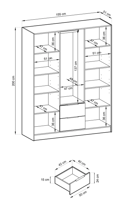- Szafa zawiera pojemne półki oraz drążek na wieszaki