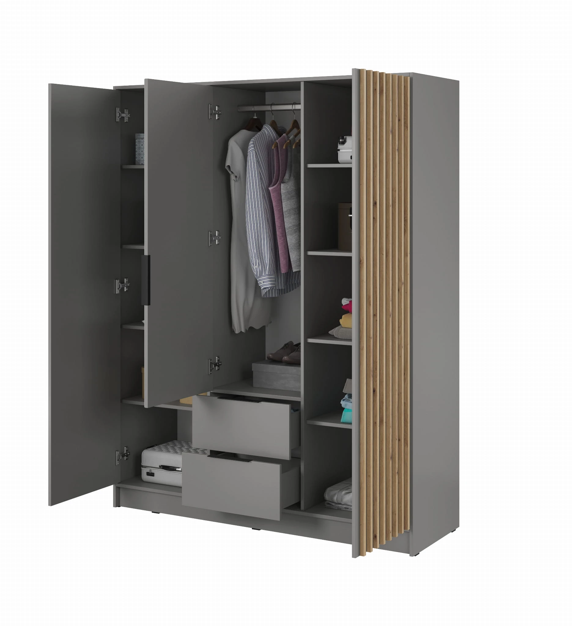 Szafa trzydrzwiowa MALWA 155 cm z lustrem i szufladami - Szary / lamele Dąb Artisan