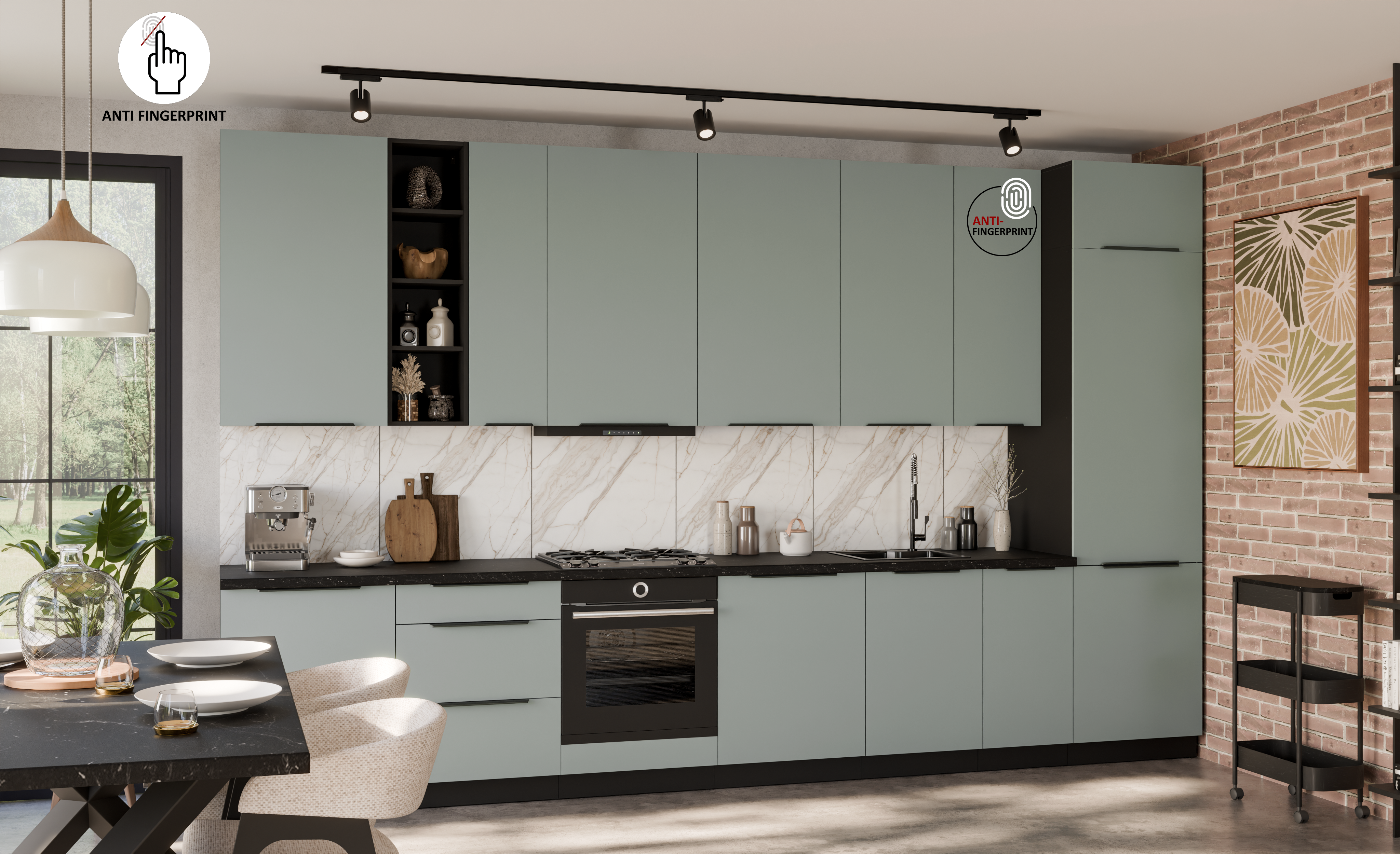 ☑️ Fronty z powłoką ANTI-FINGERPRINT – nowoczesna technologia, która skutecznie ogranicza ślady palców i ułatwia utrzymanie mebli w idealnej czystości. Matowe wykończenie nadaje frontom elegancki wygląd i sprawia, że są przyjemne w dotyku.