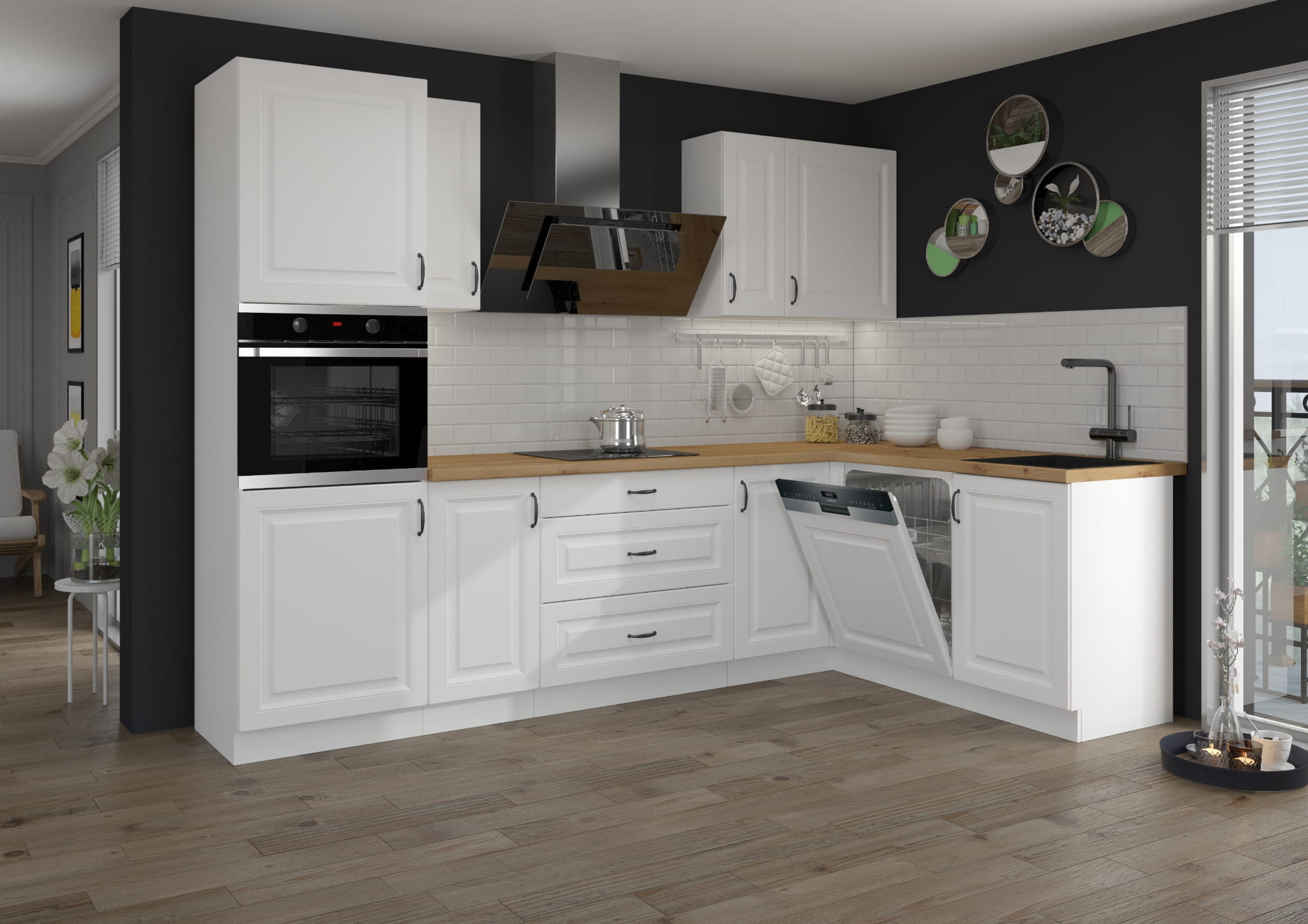 - Białe matowe fronty z frezami + korpus w kolorze białym