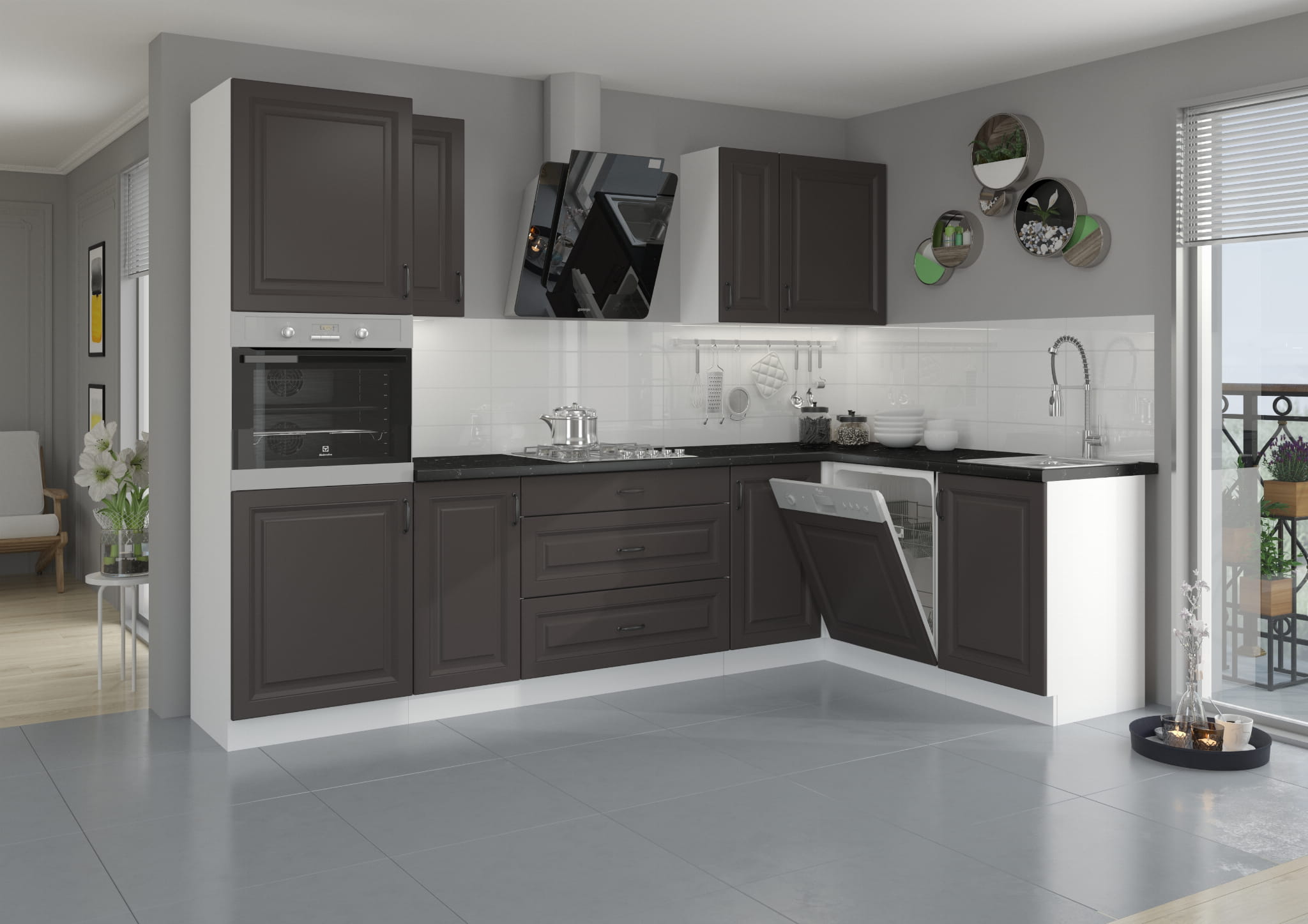 - Grafitowe matowe fronty z frezami + korpus w kolorze białym