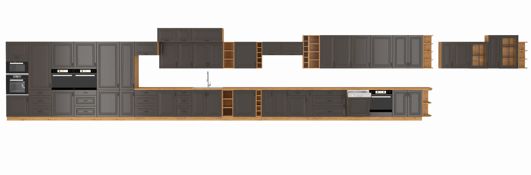 - Grafitowe matowe fronty z frezami + korpus w kolorze dąb artisan