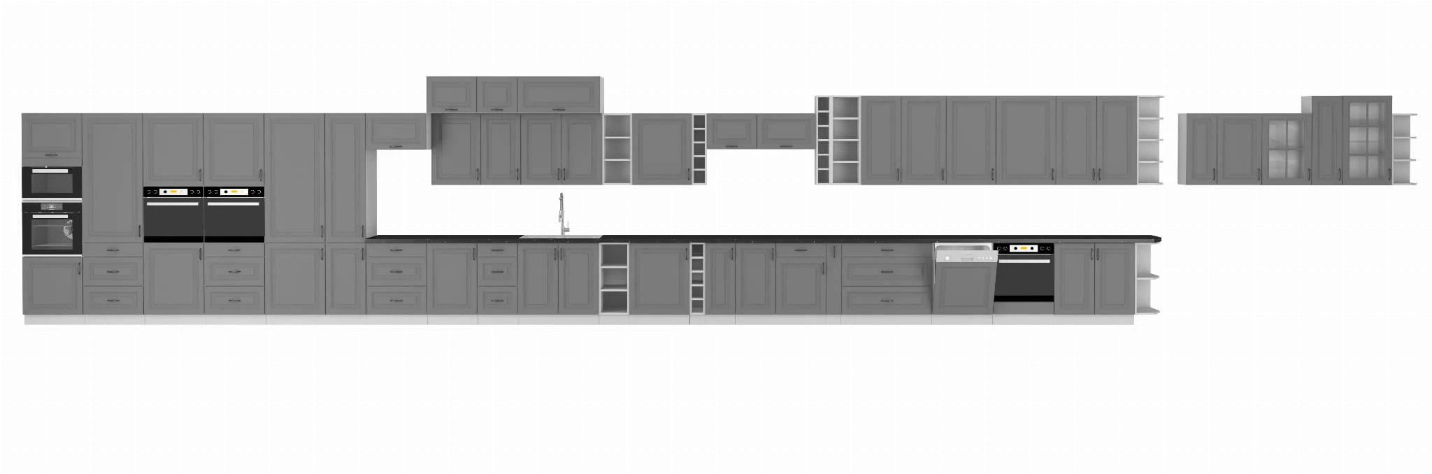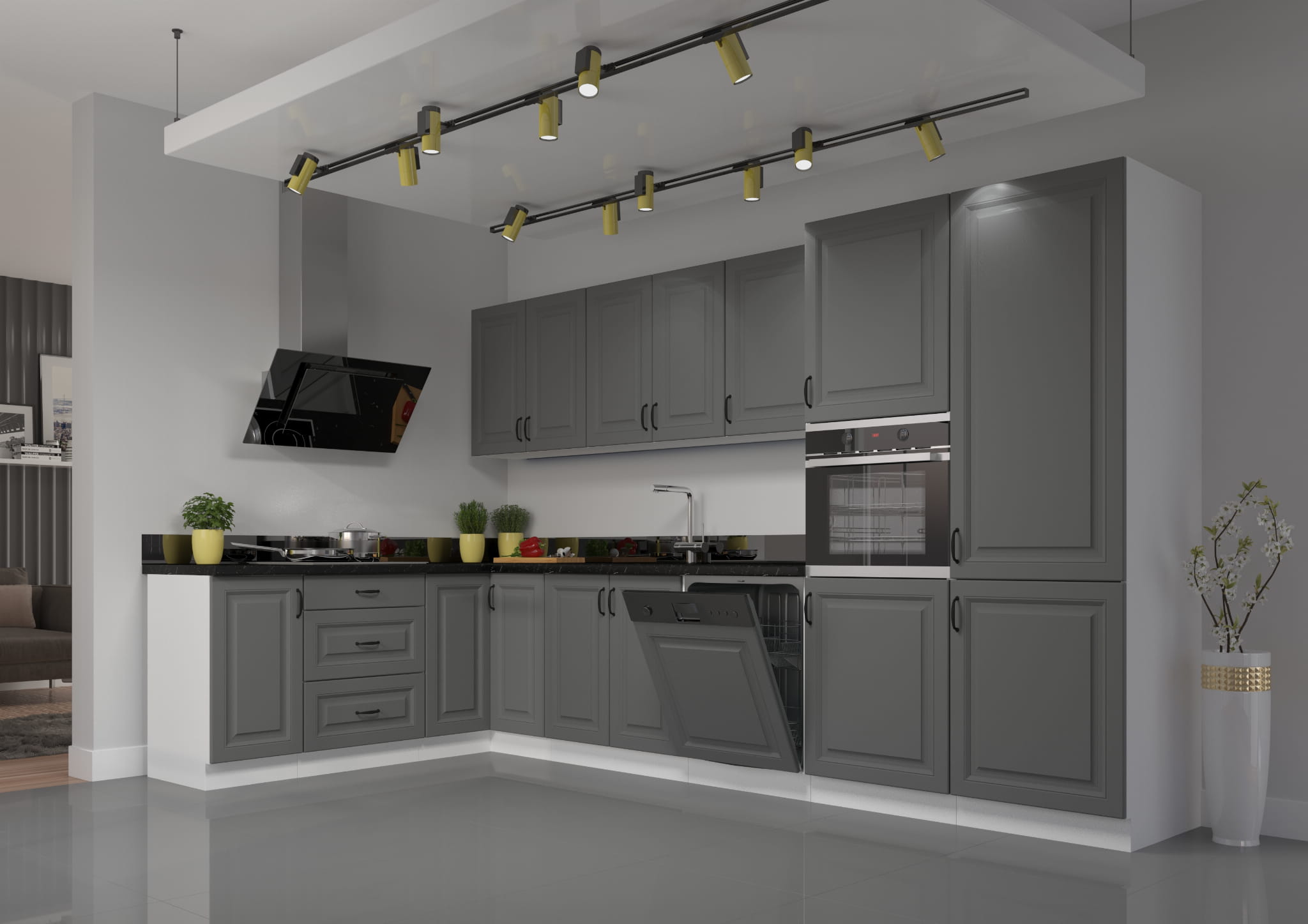 - Szare matowe fronty z frezami + korpus w kolorze białym