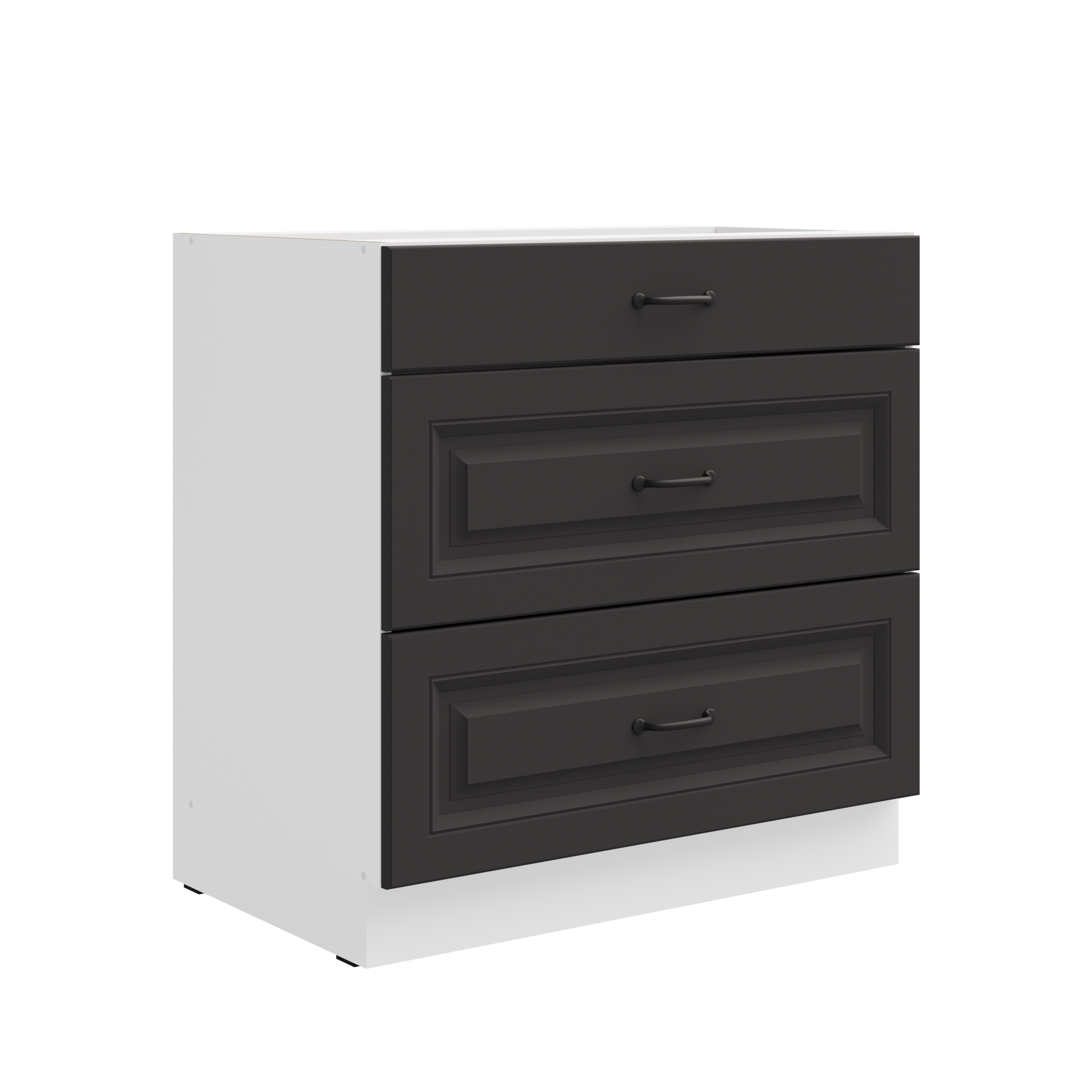 Szafka dolna 80 D 3S BB z kolekcji ATENA to funkcjonalny mebel wyposażony w trzy pojemne szuflady, które pomagają utrzymać porządek i zapewniają szybki dostęp do codziennych akcesoriów kuchennych. Grafitowe, matowe fronty z frezami oraz czarne uchwyty nadają kuchni nowoczesny, stylowy wygląd, który łatwo dopasować do różnych aranżacji. Biały korpus szafki doskonale współgra z frontami.