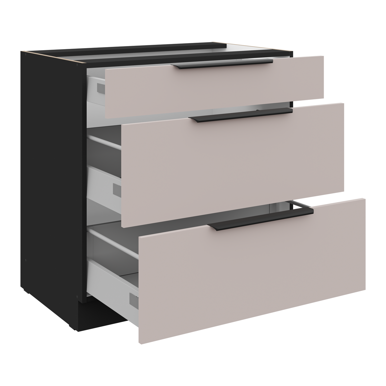 Szafka dolna 80 D 3S BB z kolekcji KASZMIR to idealne rozwiązanie dla osób poszukujących połączenia funkcjonalności i eleganckiego stylu. Wyposażona w trzy przestronne szuflady - ta szafka zapewnia szybki dostęp do najczęściej używanych przedmiotów – od sztućców po większe naczynia. Kolor kaszmirowy harmonizuje z matowym wykończeniem i nadaje kuchni ciepła, natomiast czarny korpus i uchwyty przyciągają uwagę nowoczesną formą. Szuflady na prowadnicach PREMIUM BOX wysuwają się płynnie i cicho, a ich pełen wysuw ułatwia organizację. To mebel, który łączy nowoczesny design z codzienną wygodą.