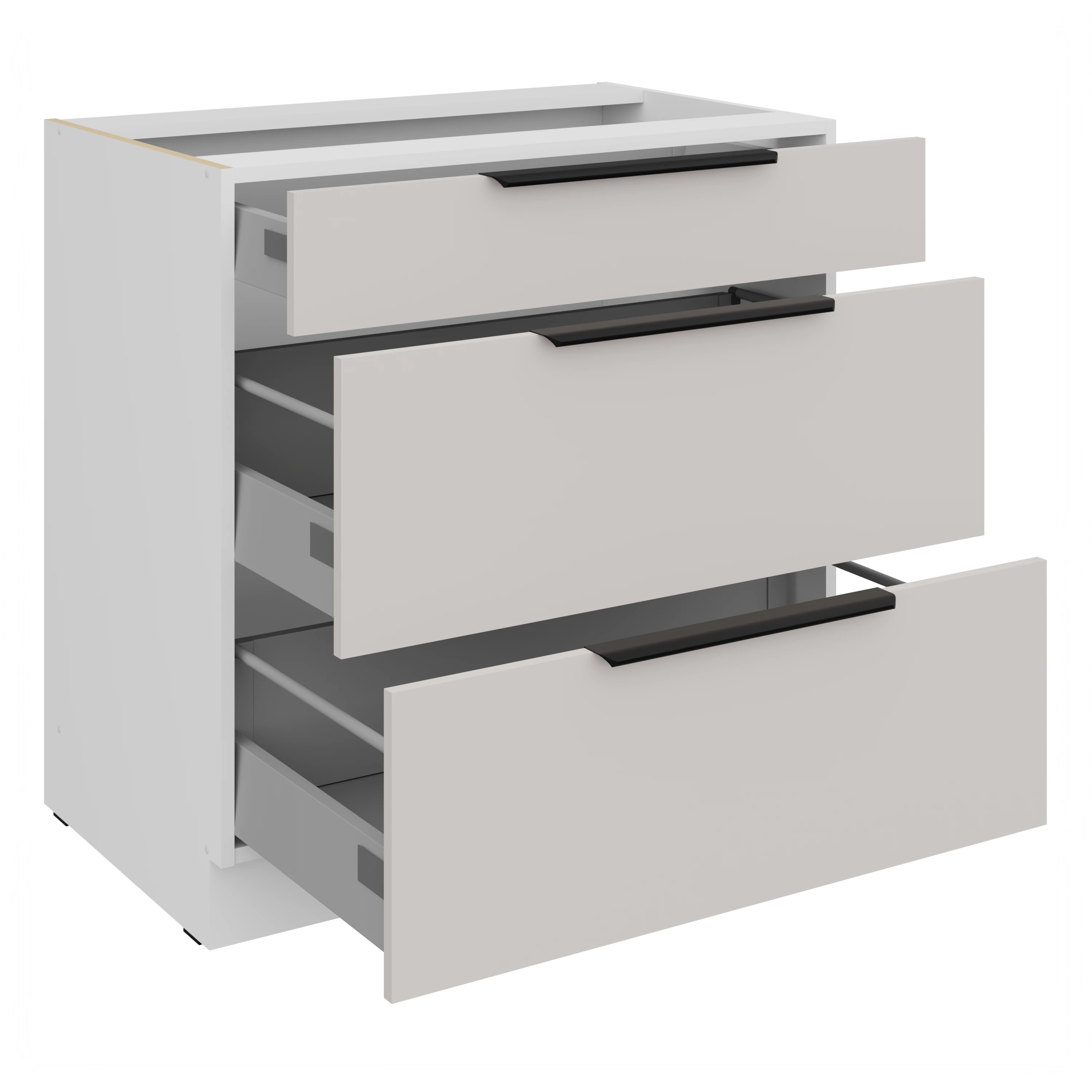 Szafka dolna 80 D 3S BB z kolekcji KASZMIR to idealne rozwiązanie dla osób poszukujących połączenia funkcjonalności i eleganckiego stylu. Wyposażona w trzy przestronne szuflady na prowadnicach premium box, gwarantuje wygodę i porządek w każdej kuchni.