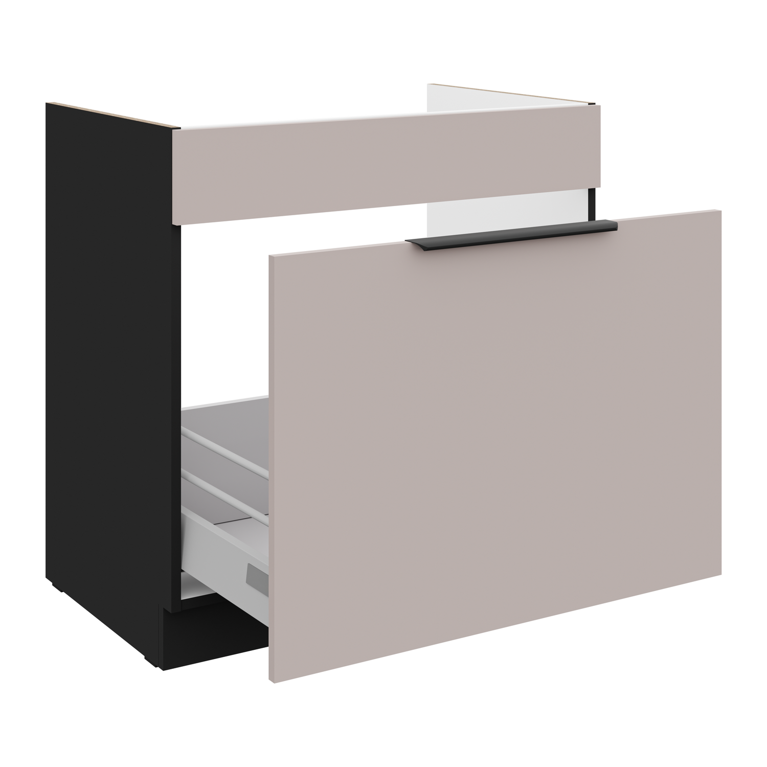 Szeroka szafka do zabudowy zlewu to wyjątkowo ergonomiczne rozwiązanie, szczególnie w kuchniach z intensywnym użytkowaniem. Front w kolorze kaszmiru harmonijnie łączy się z czarnym korpusem, nadając całości charakteru. Praktyczna szuflada pozwala na przechowywanie akcesoriów czyszczących, a przestrzeń pod zlewem może zostać dopasowana do indywidualnych potrzeb. Szafka wyróżnia się zarówno wyglądem, jak i funkcjonalnością.