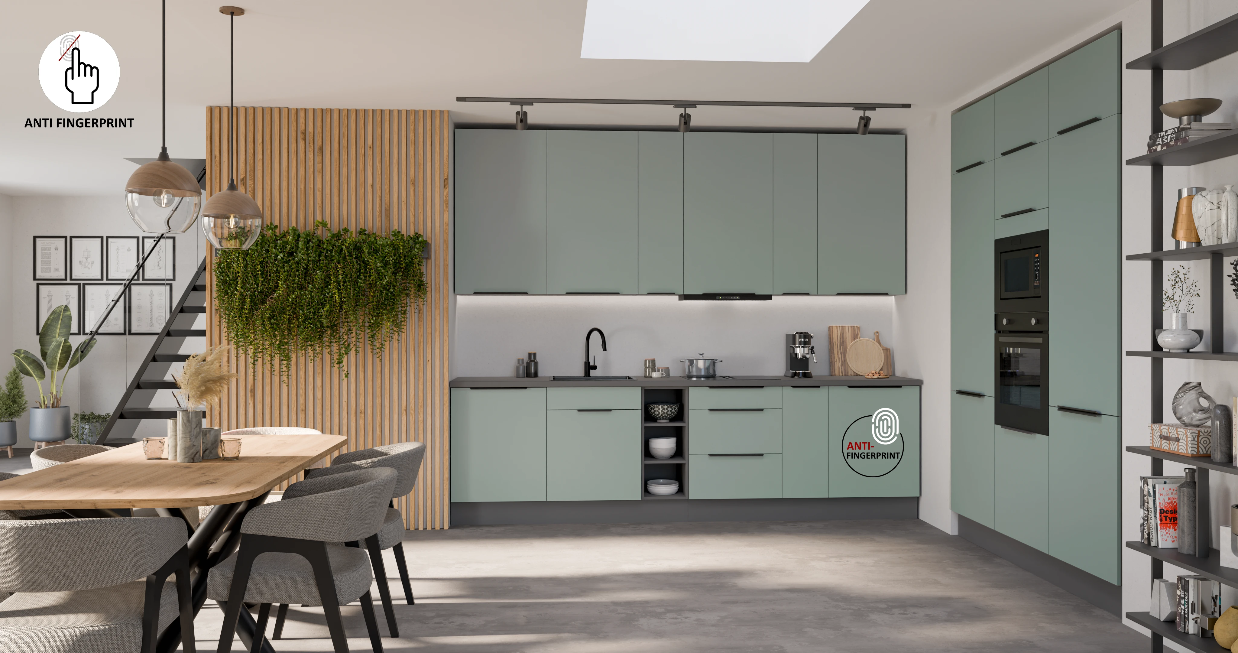 CALIA to nowoczesna kolekcja mebli kuchennych, łącząca styl, funkcjonalność i najwyższą jakość wykonania. Jej największym wyróżnikiem są fronty pokryte innowacyjną powłoką ANTI-FINGERPRINT, która skutecznie ogranicza powstawanie śladów palców. Dzięki niej powierzchnie mebli pozostają czyste i estetyczne na dłużej, a matowe wykończenie frontów nadaje im elegancki, nowoczesny charakter.
