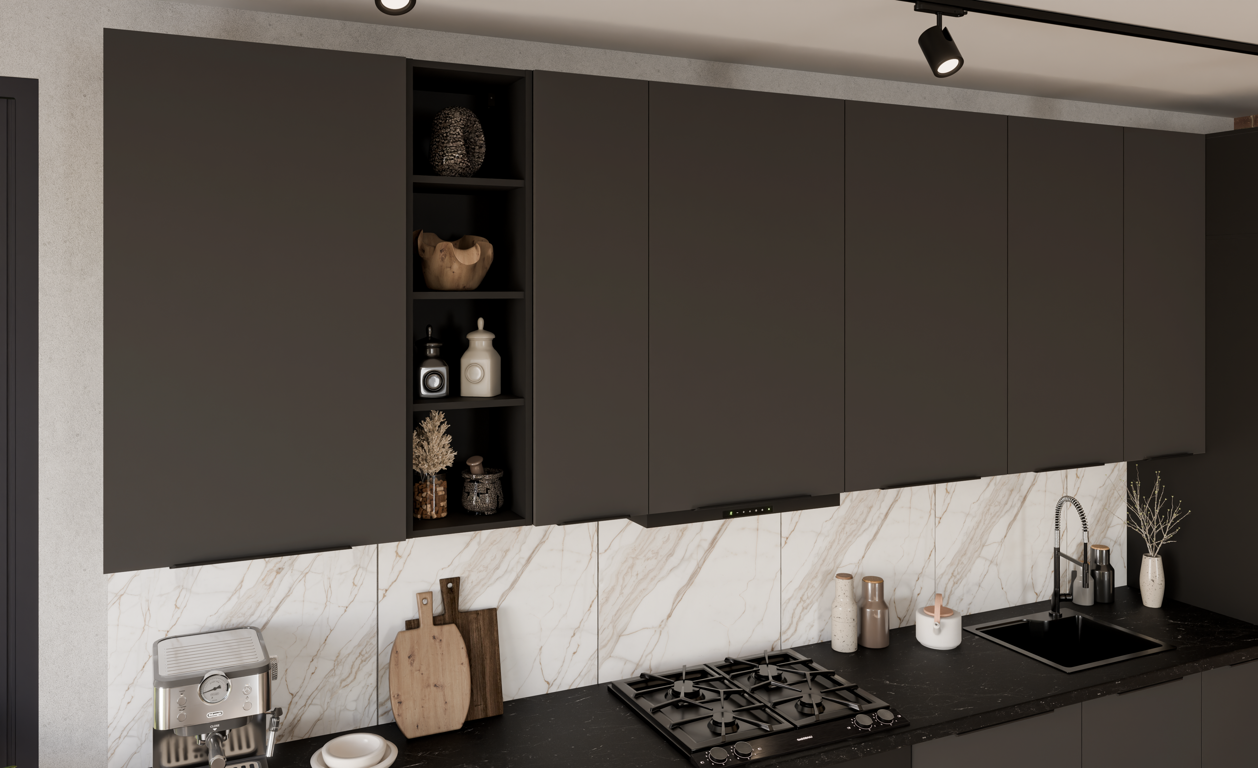 CALIA to nowoczesna kolekcja mebli kuchennych, łącząca styl, funkcjonalność i najwyższą jakość wykonania. Jej największym wyróżnikiem są fronty pokryte innowacyjną powłoką ANTI-FINGERPRINT, która skutecznie ogranicza powstawanie śladów palców. Dzięki niej powierzchnie mebli pozostają czyste i estetyczne na dłużej, a matowe wykończenie frontów nadaje im elegancki, nowoczesny charakter.