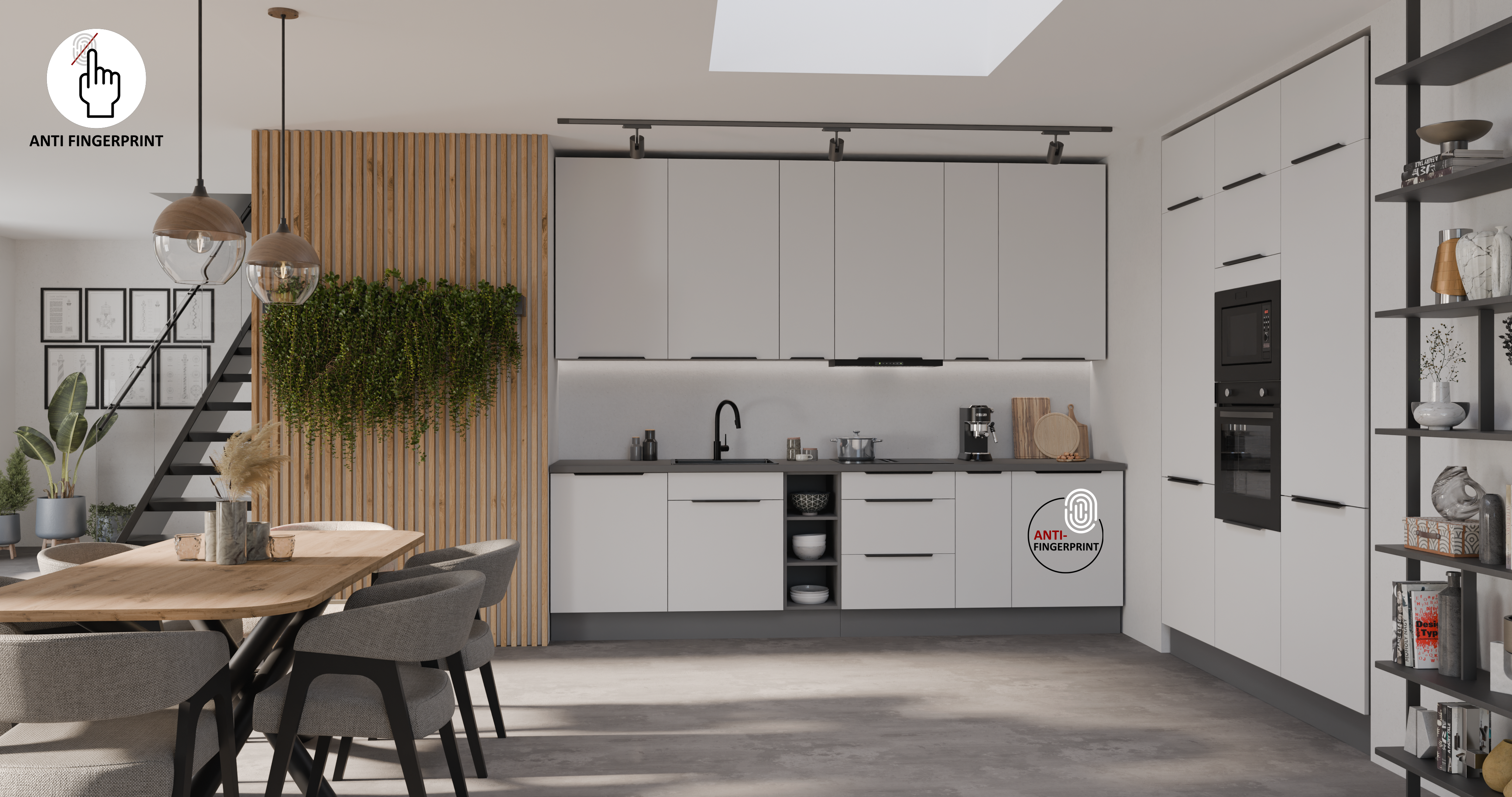 ☑️ Fronty z powłoką ANTI-FINGERPRINT – nowoczesna technologia, która skutecznie ogranicza ślady palców i ułatwia utrzymanie mebli w idealnej czystości. Matowe wykończenie nadaje frontom elegancki wygląd i sprawia, że są przyjemne w dotyku.