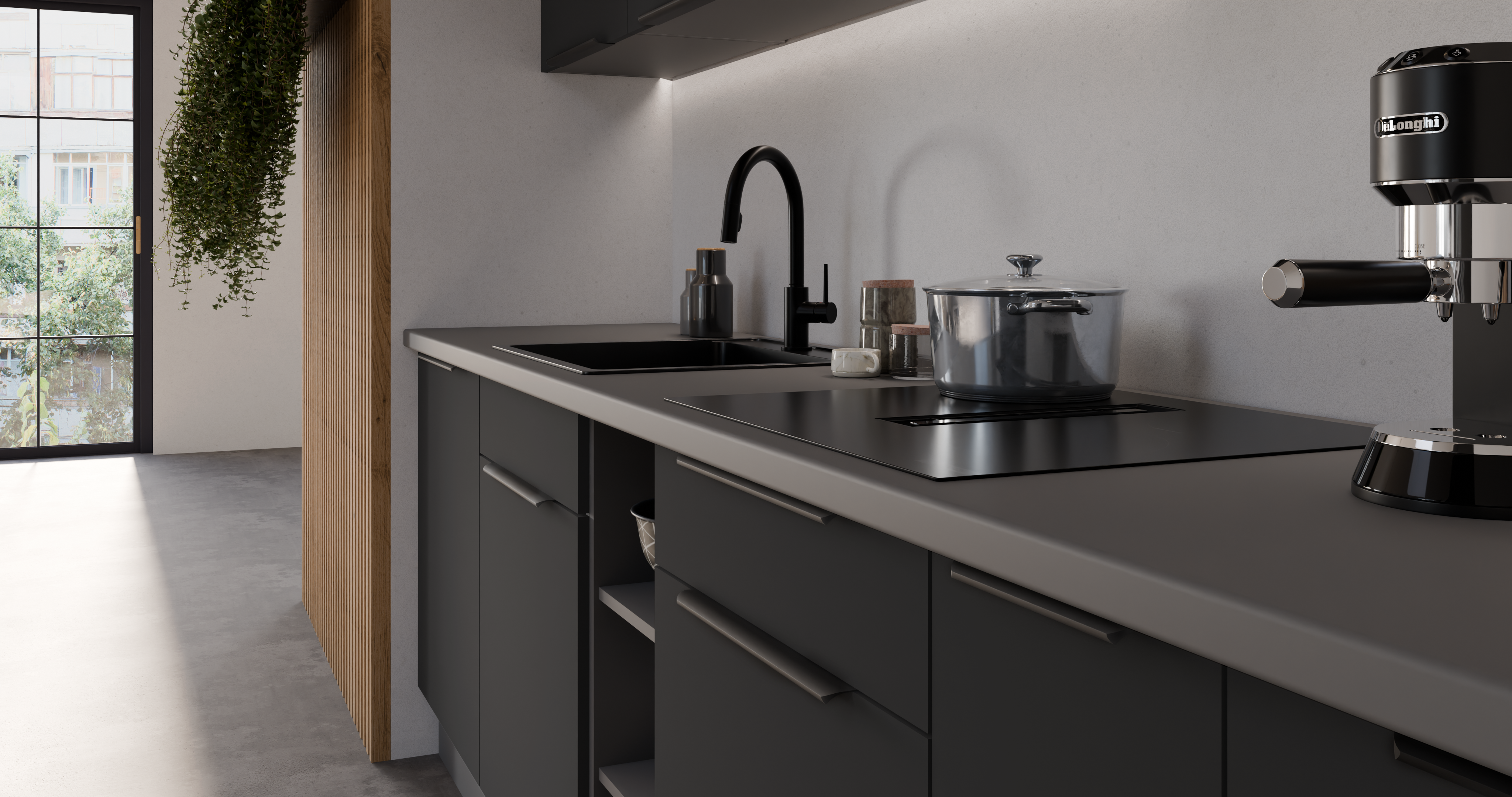 CALIA to nowoczesna kolekcja mebli kuchennych, łącząca styl, funkcjonalność i najwyższą jakość wykonania. Jej największym wyróżnikiem są fronty pokryte innowacyjną powłoką ANTI-FINGERPRINT, która skutecznie ogranicza powstawanie śladów palców. Dzięki niej powierzchnie mebli pozostają czyste i estetyczne na dłużej, a matowe wykończenie frontów nadaje im elegancki, nowoczesny charakter.