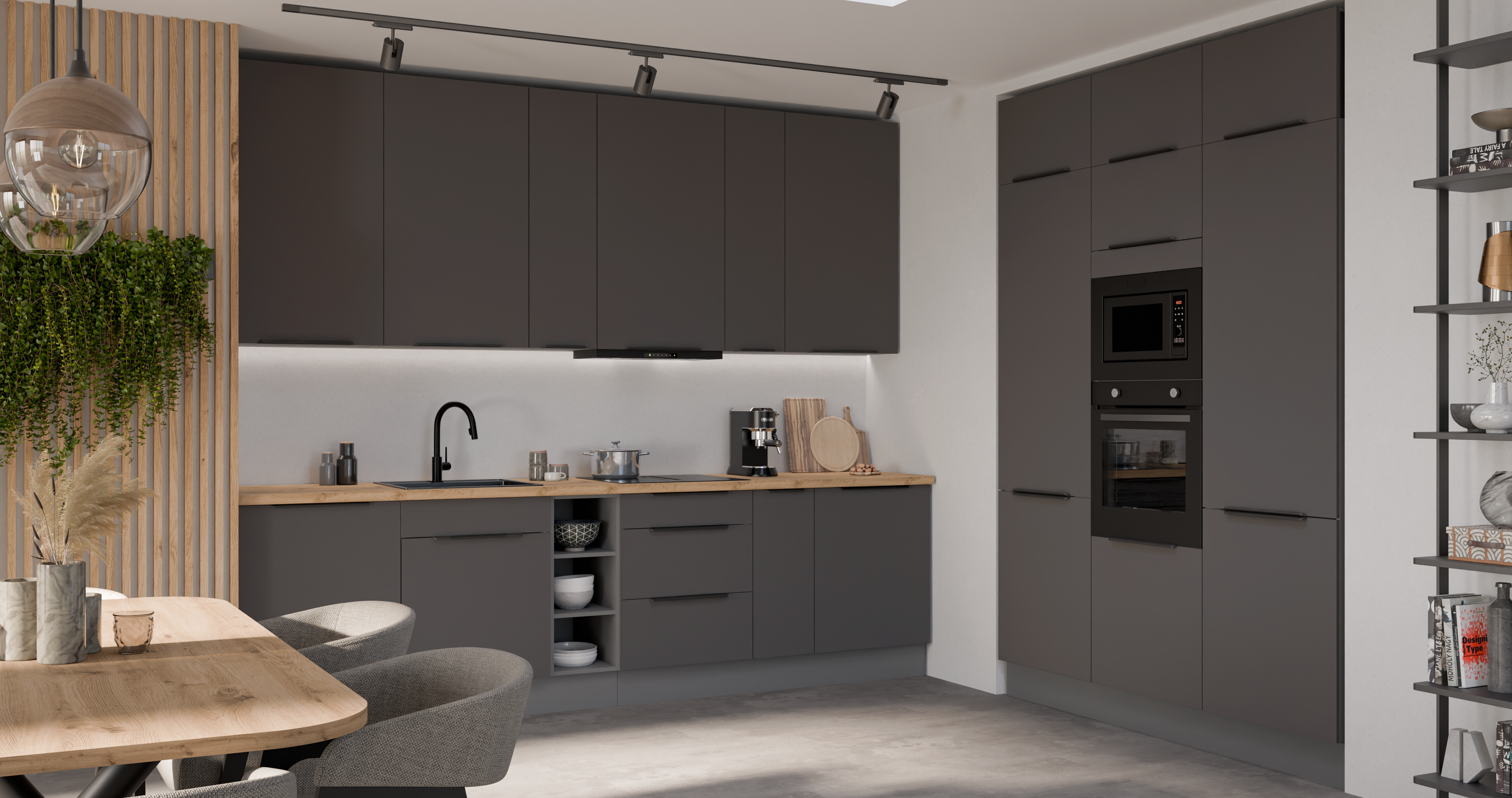 UWAGA! Szafki dolne z kolekcji kuchennej CALIA wykonane na korpusie w kolorze Antracyt - NIE posiadają w zestawie cokołów dociętych pod wymiar szafki! Szafki stoją na czarnych regulowanych nóżkach.