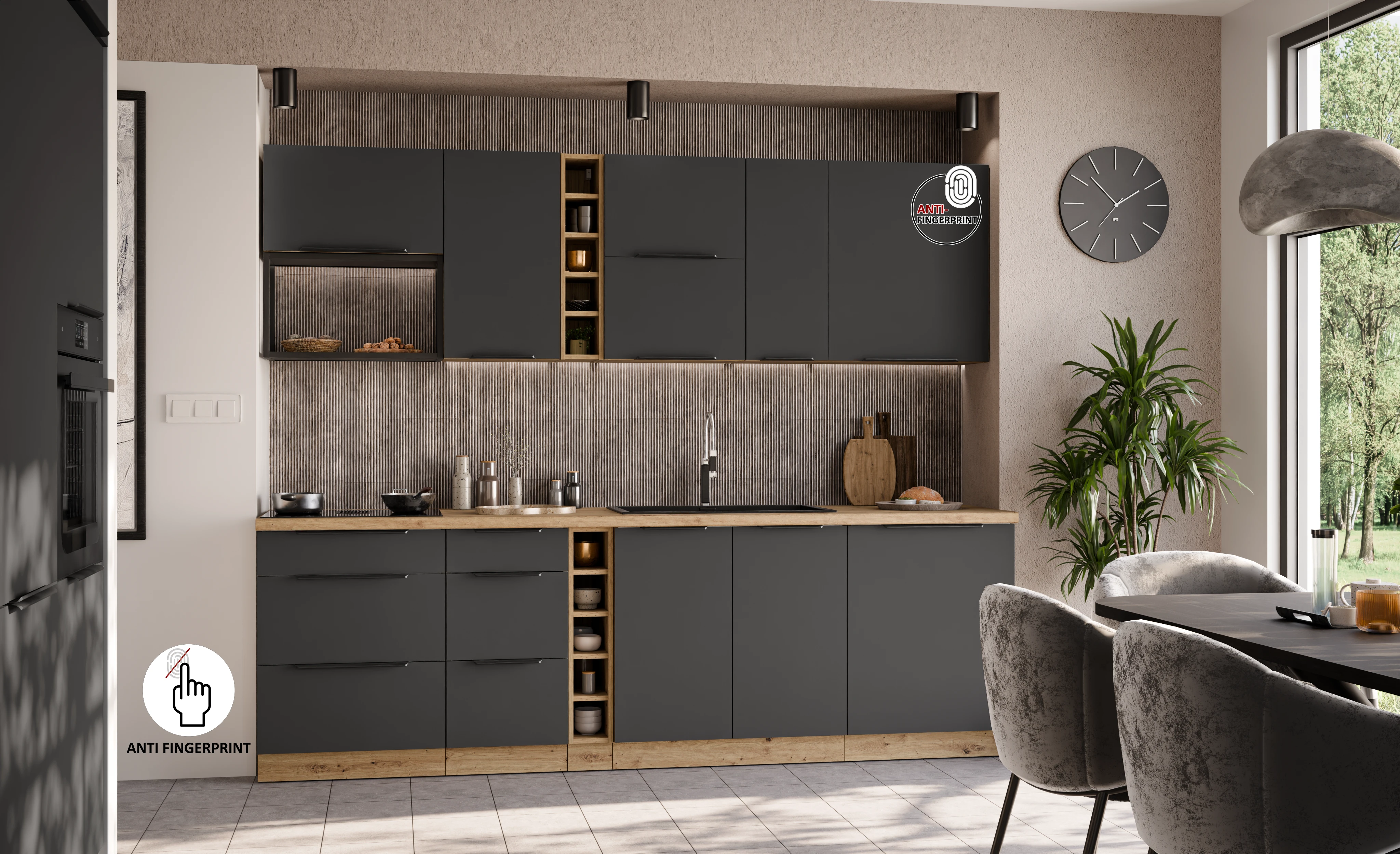 ☑️ Fronty z powłoką ANTI-FINGERPRINT – nowoczesna technologia, która skutecznie ogranicza ślady palców i ułatwia utrzymanie mebli w idealnej czystości. Matowe wykończenie nadaje frontom elegancki wygląd i sprawia, że są przyjemne w dotyku.