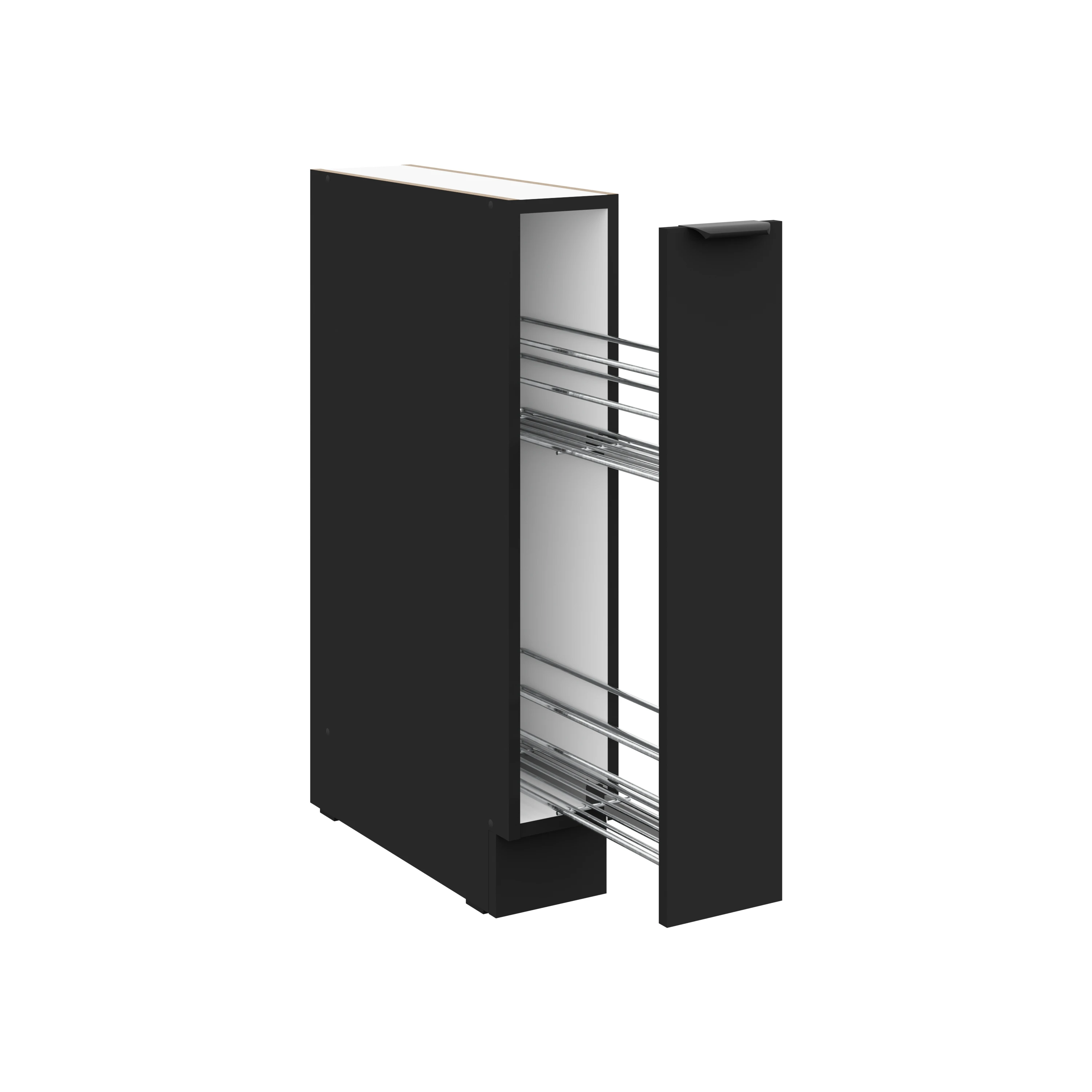 Mała, ale niezwykle praktyczna szafka dolna DECO 15 D CARGO BB z wysuwanym koszem cargo w modnym czarnym macie to doskonałe uzupełnienie kuchni o dodatkową przestrzeń do przechowywania. Matowe fronty, czarny korpus i uchwyty tworzą nowoczesny i stylowy wygląd. Kosz cargo umożliwia wygodne przechowywanie drobnych akcesoriów i produktów, a system cichego domyku gwarantuje komfortowe i ciche zamykanie. Idealna do wykorzystania nawet w niewielkich przestrzeniach kuchennych.