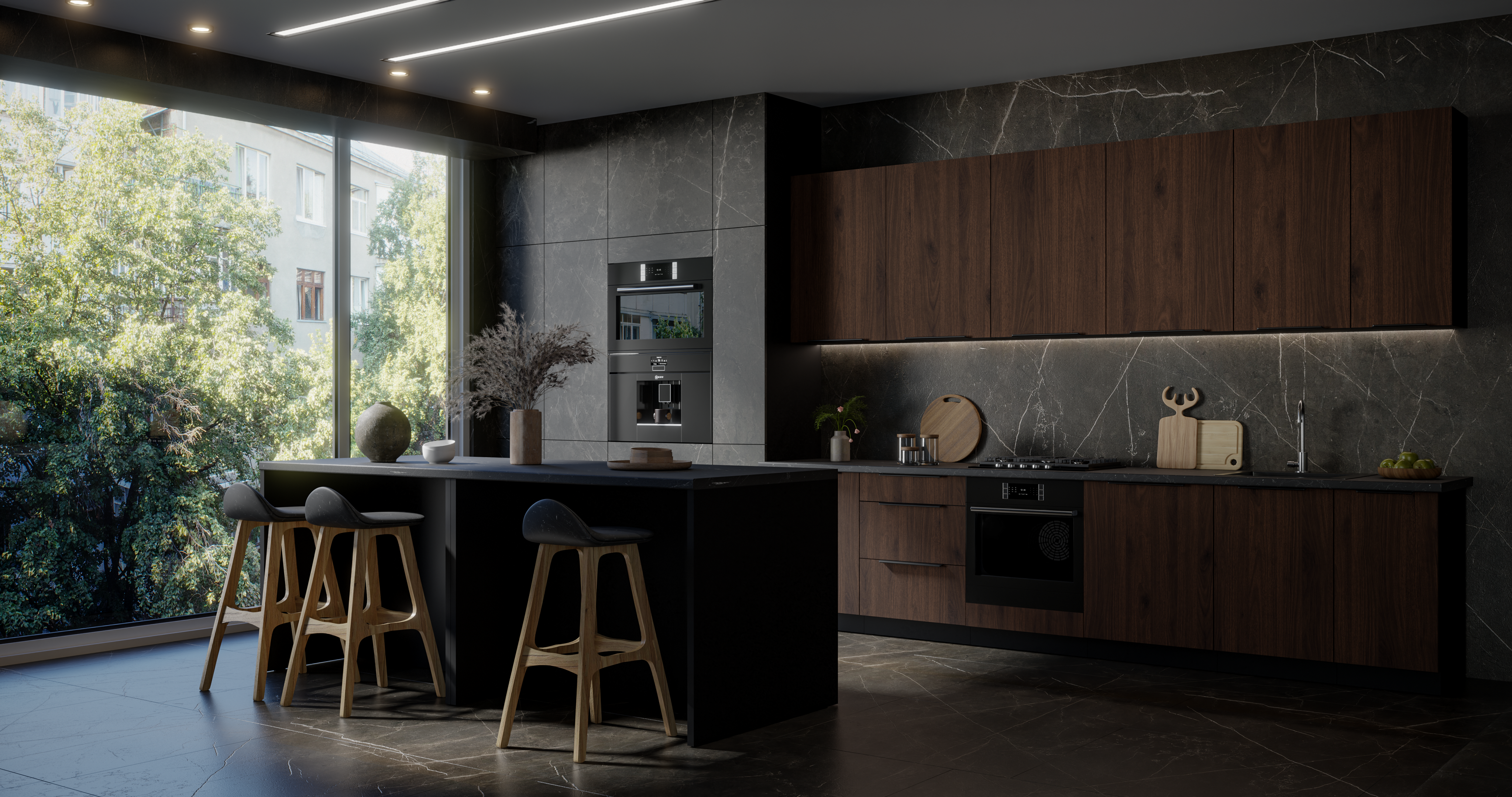 - Orzechowe fronty o matowym wykończeniu + korpus w kolorze czarnym