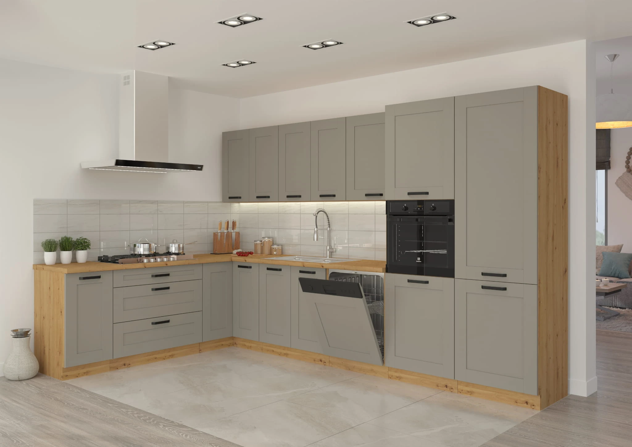 Matowe fronty MDF w jasnoszarym kolorze z dekoracyjnym frezowaniem, biały korpus i czarne uchwyty to zestawienie, które idealnie sprawdzi się w każdej nowoczesnej kuchni. Cichy domyk i jakość prowadnic PREMIUM to gwarancja wygody i trwałości.