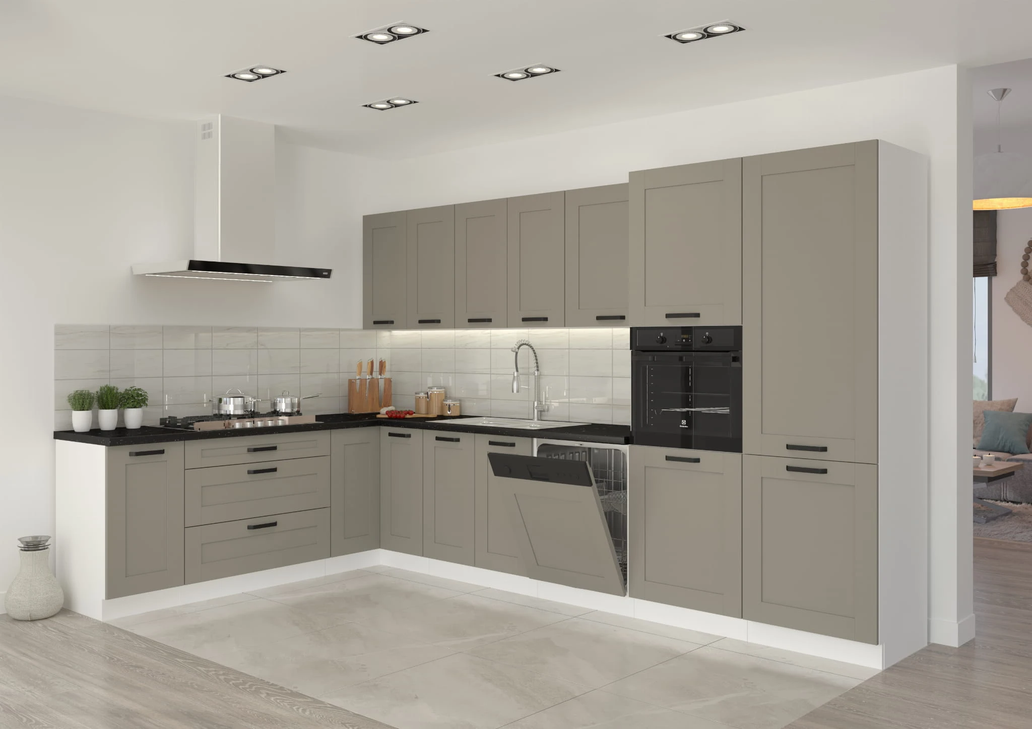 Matowe fronty MDF w jasnoszarym kolorze z dekoracyjnym frezowaniem, biały korpus i czarne uchwyty to zestawienie, które idealnie sprawdzi się w każdej nowoczesnej kuchni. Cichy domyk i jakość prowadnic PREMIUM to gwarancja wygody i trwałości.