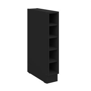 Wąska, otwarta szafka dolna to praktyczne rozwiązanie w nowoczesnej kuchni. Idealnie sprawdzi się do przechowywania przypraw, butelek lub drobiazgów, które chcesz mieć zawsze pod ręką. Czarne wykończenie nadaje jej lekkości i świeżości. Dzięki swojej wąskiej formie szafka idealnie nadaje się do wypełniania przestrzeni między większymi elementami zabudowy, jednocześnie zwiększając funkcjonalność kuchni.