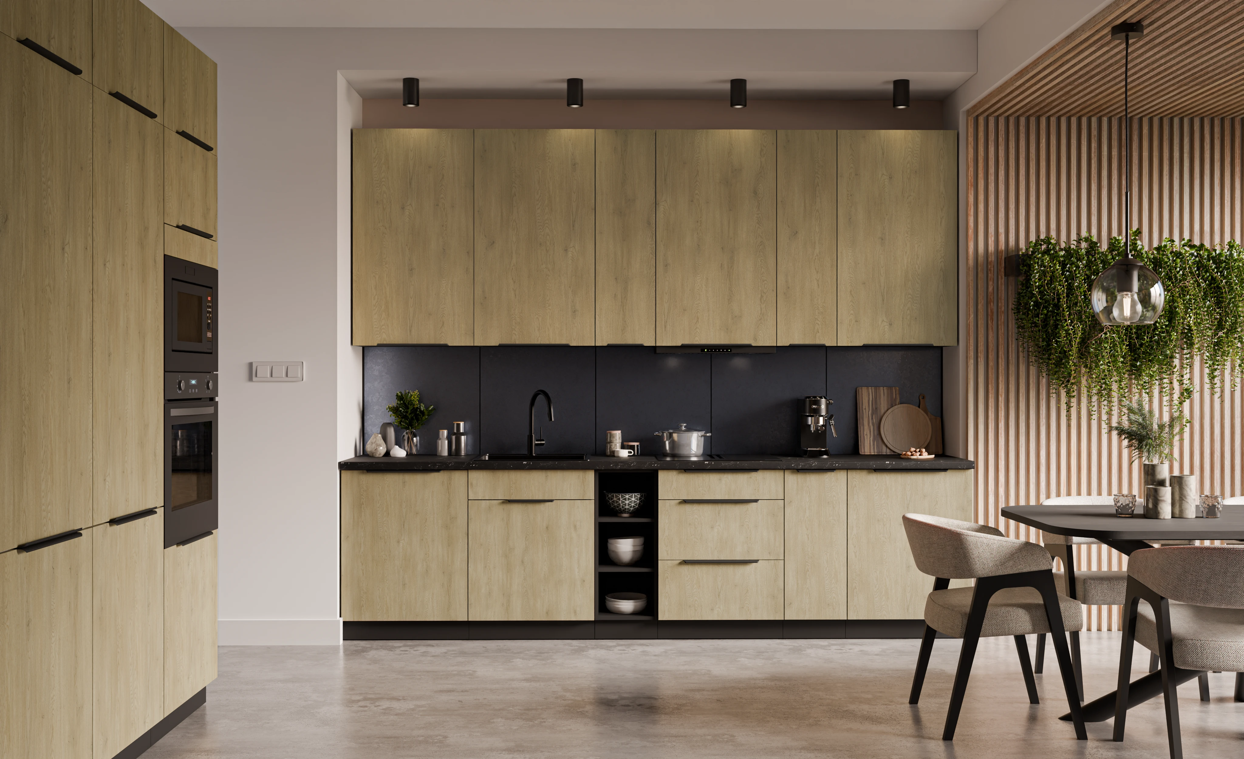 ☑️ Nowoczesny design – matowe fronty w kolorze Dąb Cremona w połączeniu z czarnym korpusem i uchwytem krawędziowym UA-HEXA z aluminium tworzą wyrafinowany, a zarazem ponadczasowy wygląd.