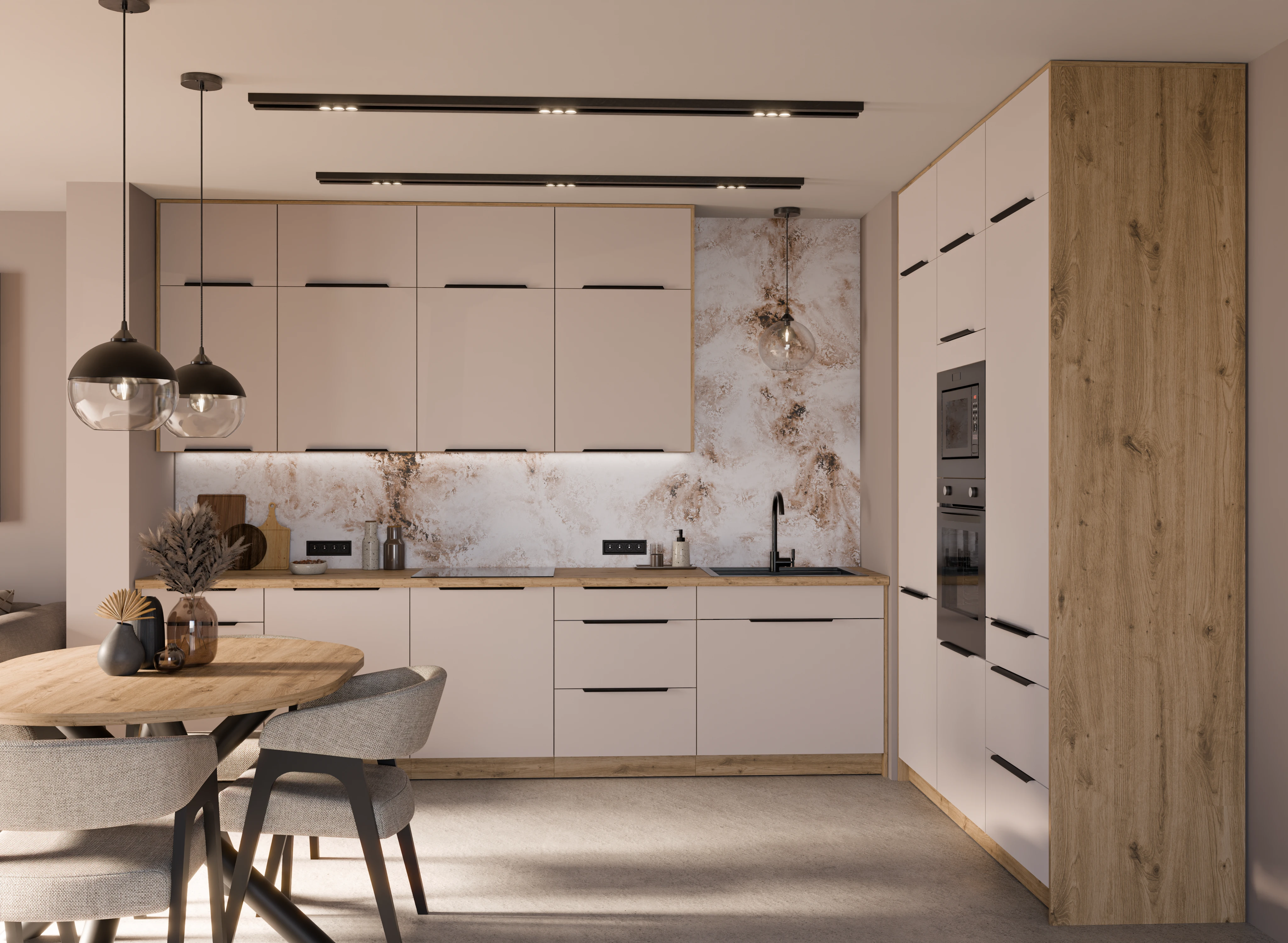 Jej wąska bryła pozwala na zabudowę nawet w trudnodostępnych miejscach, a kaszmirowy front zyskuje na popularności wśród klientów poszukujących nietuzinkowych, ale spokojnych kolorów. Kaszmir w kuchni nadaje wnętrzu miękkości, a przy tym idealnie komponuje się z korpusem szafki w odcieniu dąb artisan.