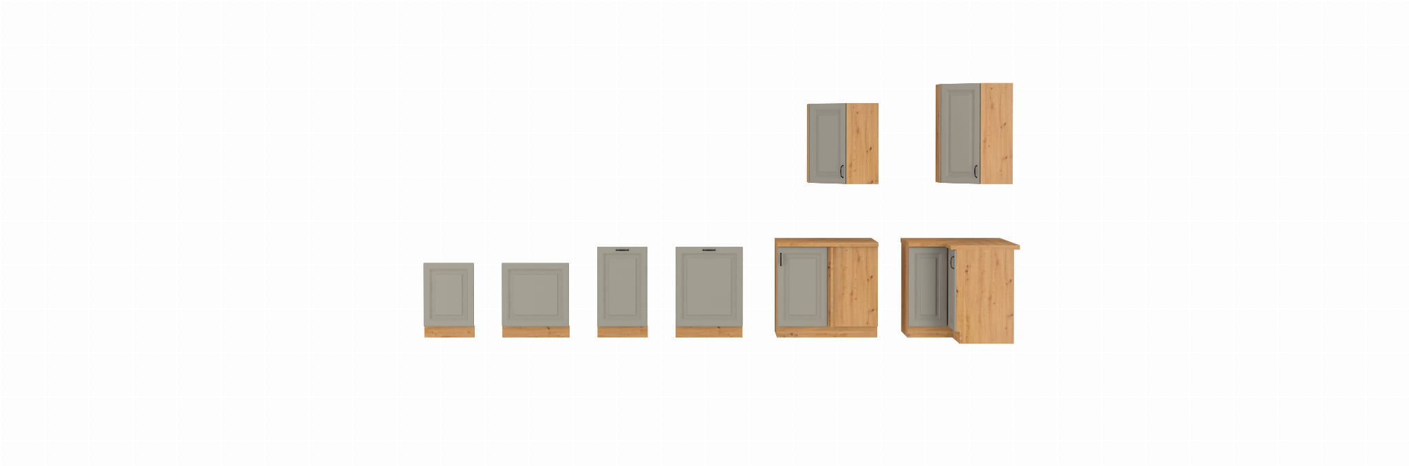 - Jasnoszare matowe fronty z frezami + korpus w kolorze dąb artisan