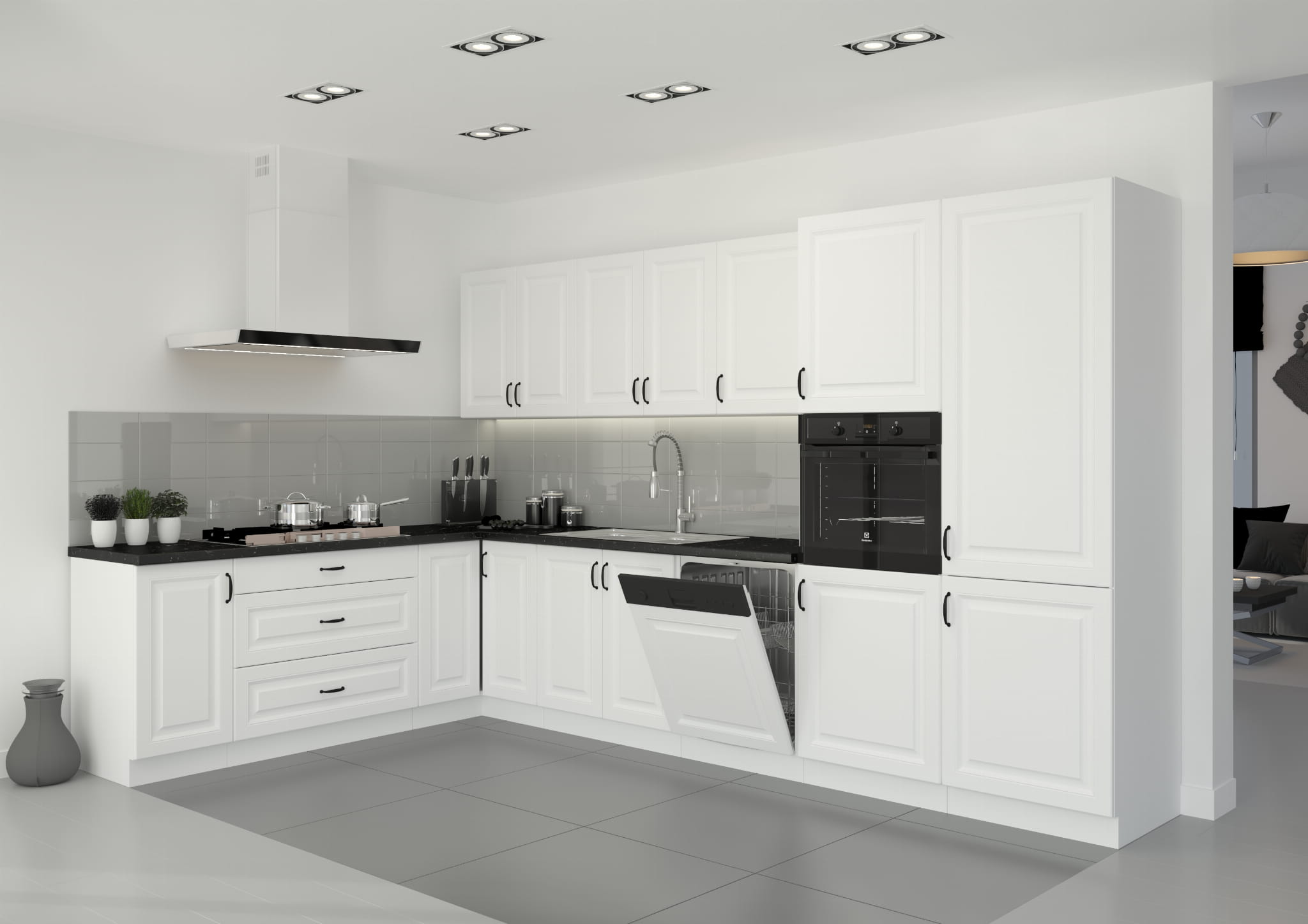 - Białe matowe fronty z frezami + korpus w kolorze białym
