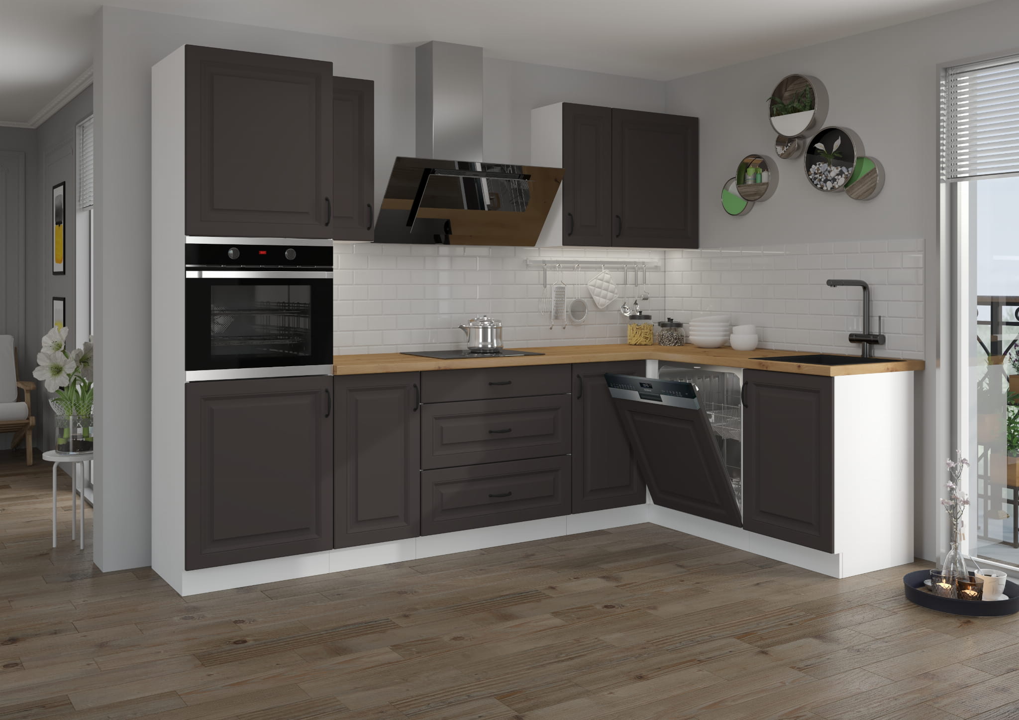 - Grafitowe matowe fronty z frezami + korpus w kolorze białym