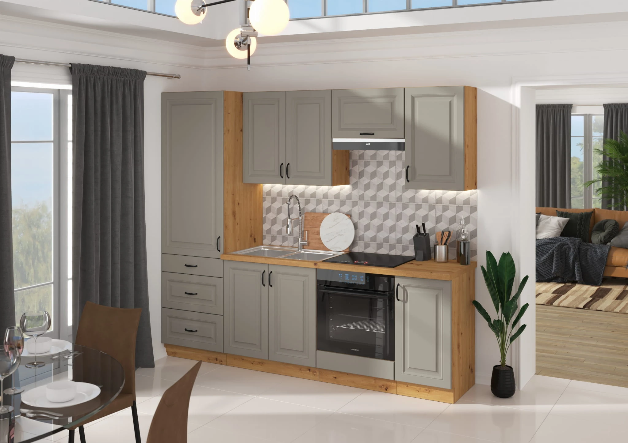 - Jasnoszare matowe fronty z frezami + korpus w kolorze dąb artisan