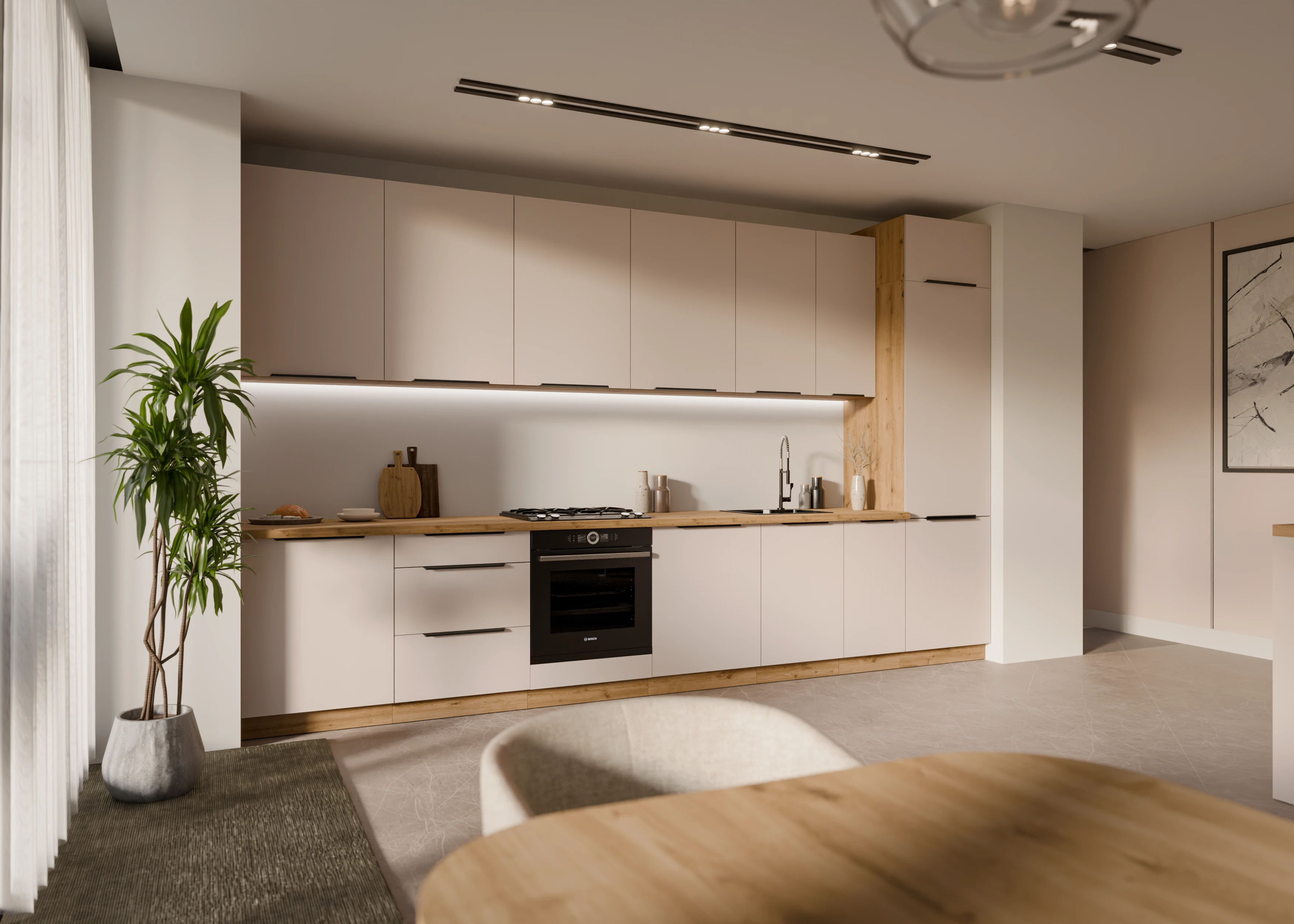 Kolor frontów w odcieniu kaszmiru to nie tylko estetyka – to świadomy wybór nowoczesnych użytkowników, którzy cenią stonowaną elegancję i spokój we wnętrzach. Kaszmir to jeden z najczęściej wybieranych kolorów ostatnich lat – pasuje zarówno do wnętrz klasycznych, jak i minimalistycznych. W połączeniu z korpusem w ciepłym dekorze dąb artisan i czarnymi uchwytami, mebel ten wprowadza do kuchni harmonię i przytulność.