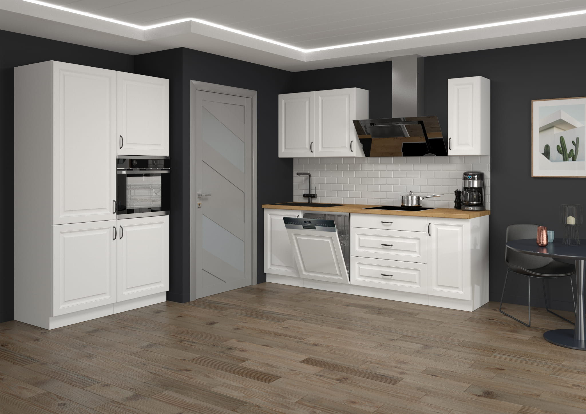 - Białe matowe fronty z frezami + korpus w kolorze białym