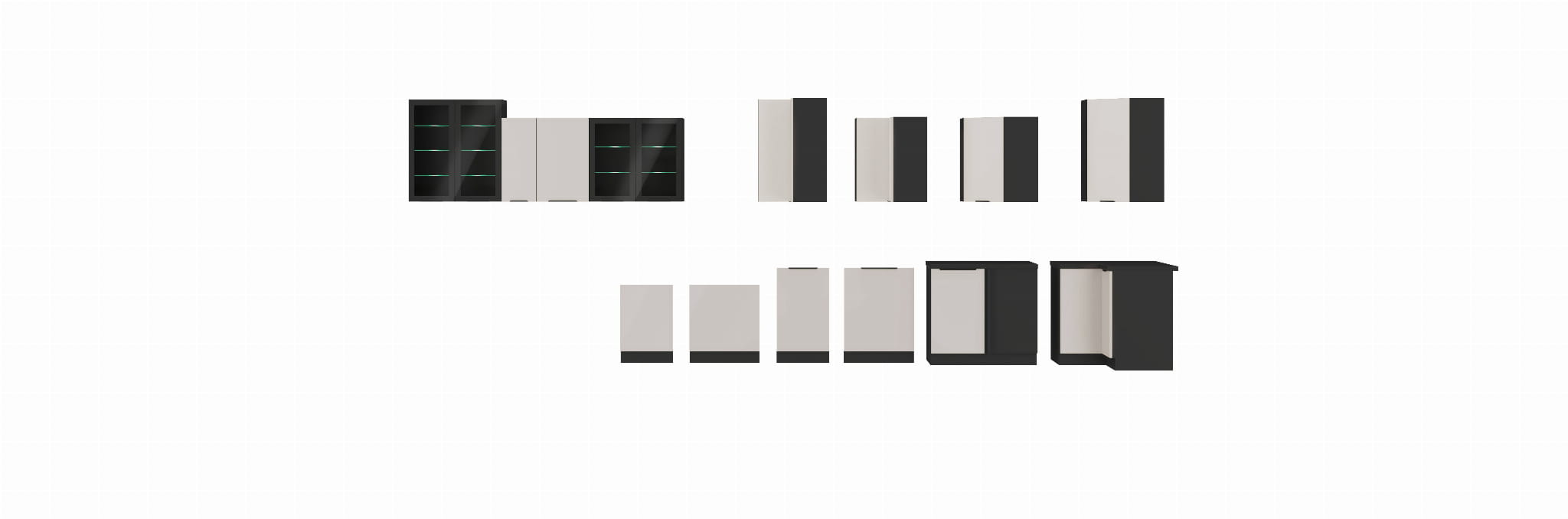 Kolekcja KASZMIR oferuje szeroki wybór szafek dolnych i górnych w różnych szerokościach, co pozwala na stworzenie zabudowy skrojonej na miarę Twojej kuchni. Warianty szafek obejmują modele narożne, z szufladami, z drzwiczkami jedno- i dwuskrzydłowymi, a także wysokie słupki do zabudowy sprzętu AGD.