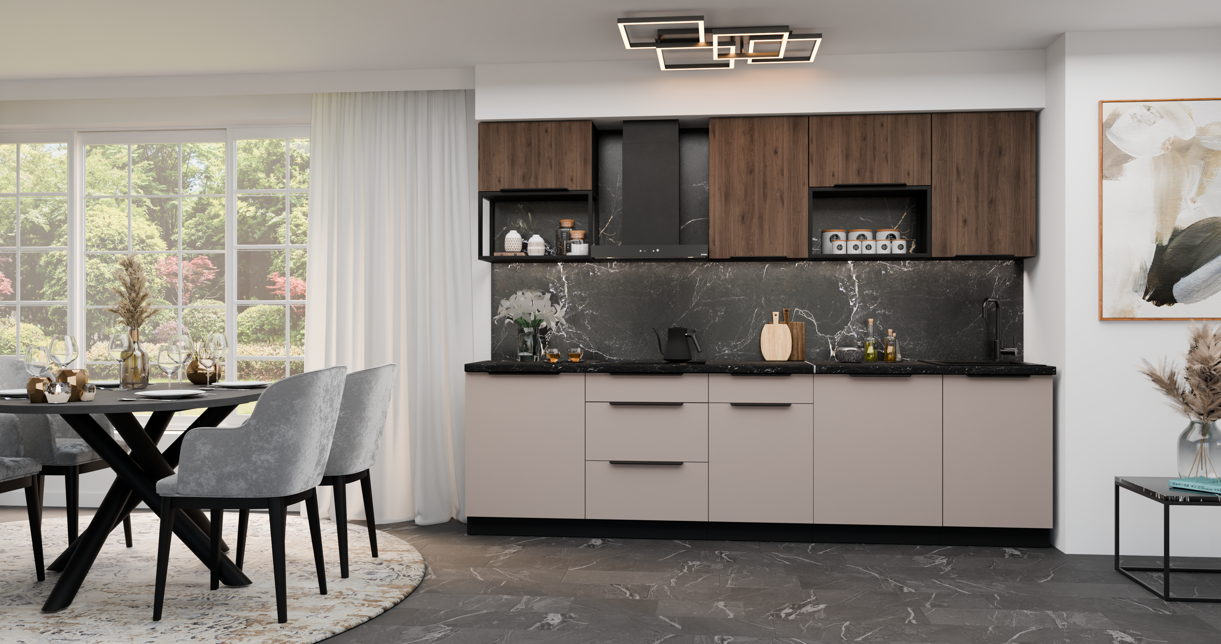 - Orzechowe fronty o matowym wykończeniu + korpus w kolorze czarnym