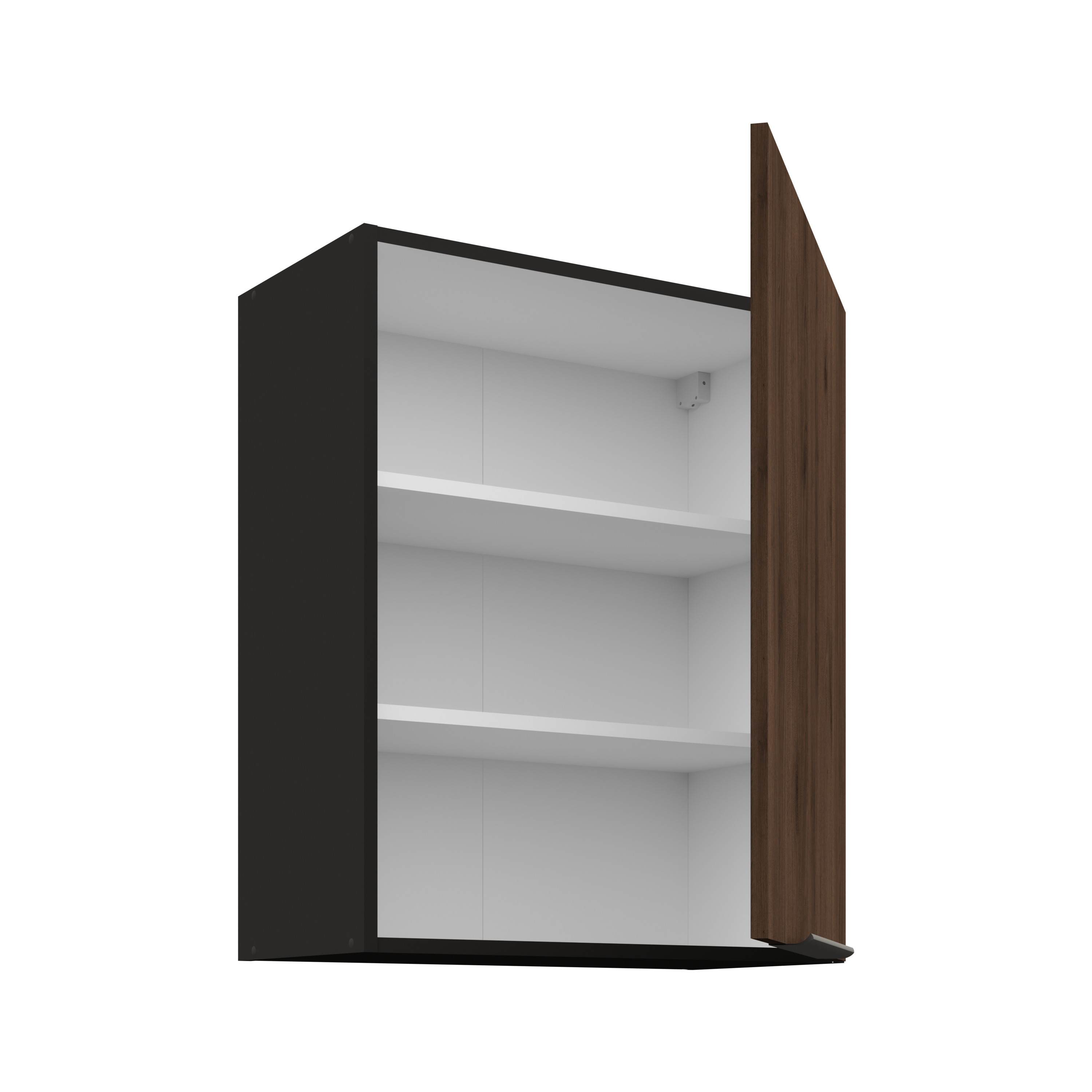 Matowy front w kolorze Orzech Okapi nawiązuje do naturalnych struktur drewna, wprowadzając do wnętrza ciepło i elegancję. W połączeniu z czarnym korpusem oraz uchwytem tworzy harmonijną całość, idealną do współczesnych aranżacji kuchennych. Mechanizm cichego domyku gwarantuje wygodę użytkowania i wyższy komfort pracy w kuchni.