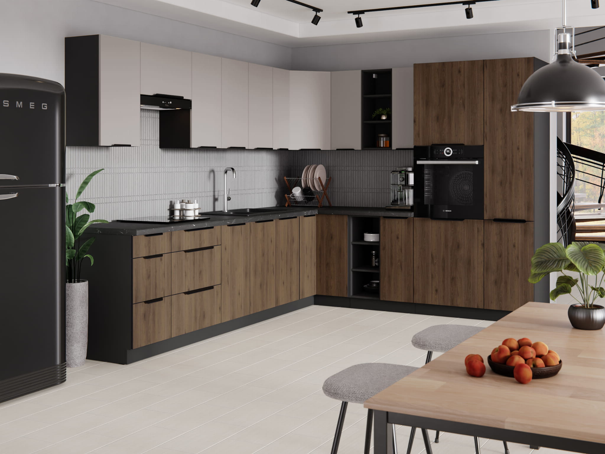 - Orzechowe fronty o matowym wykończeniu + korpus w kolorze czarnym