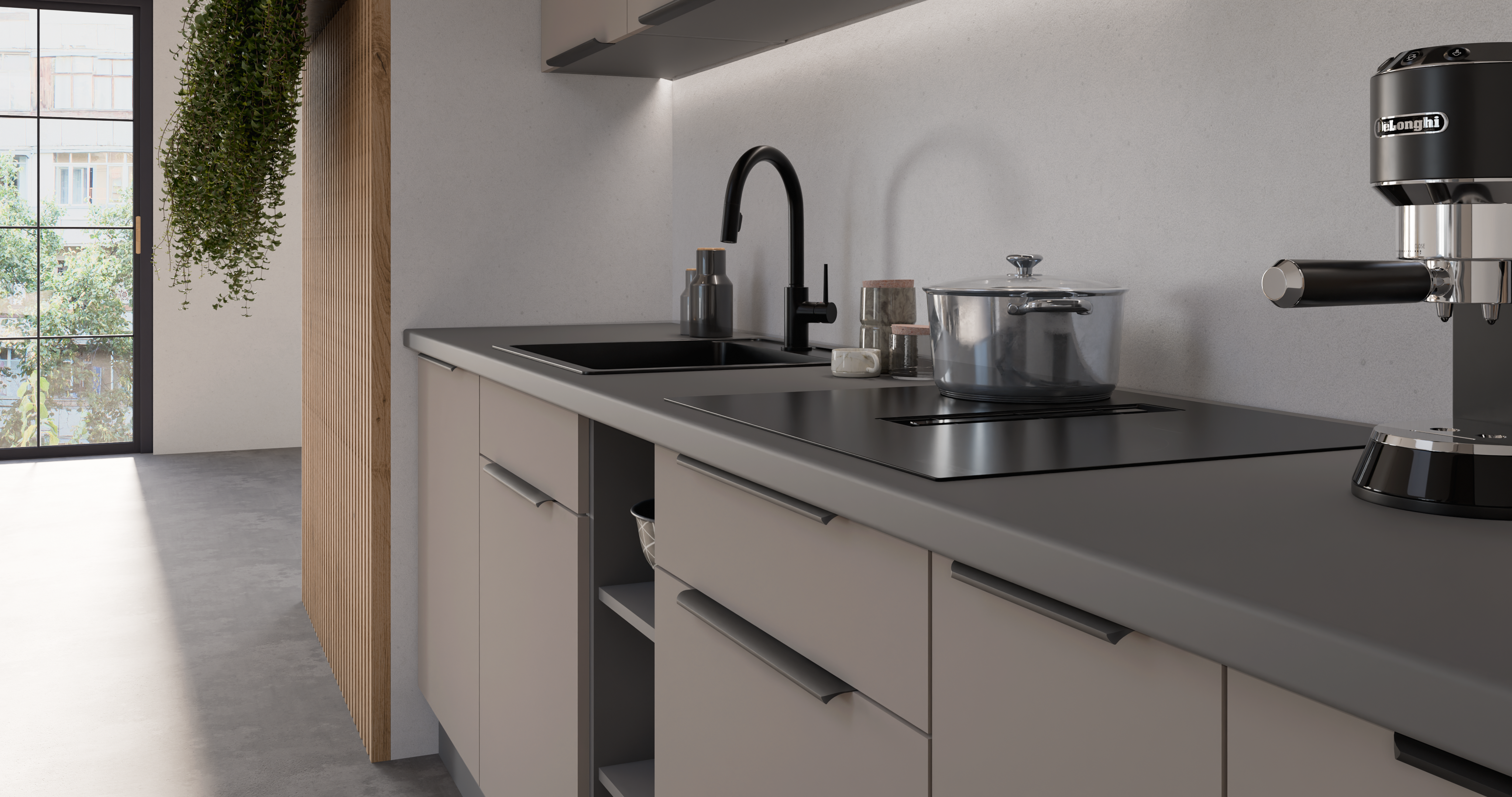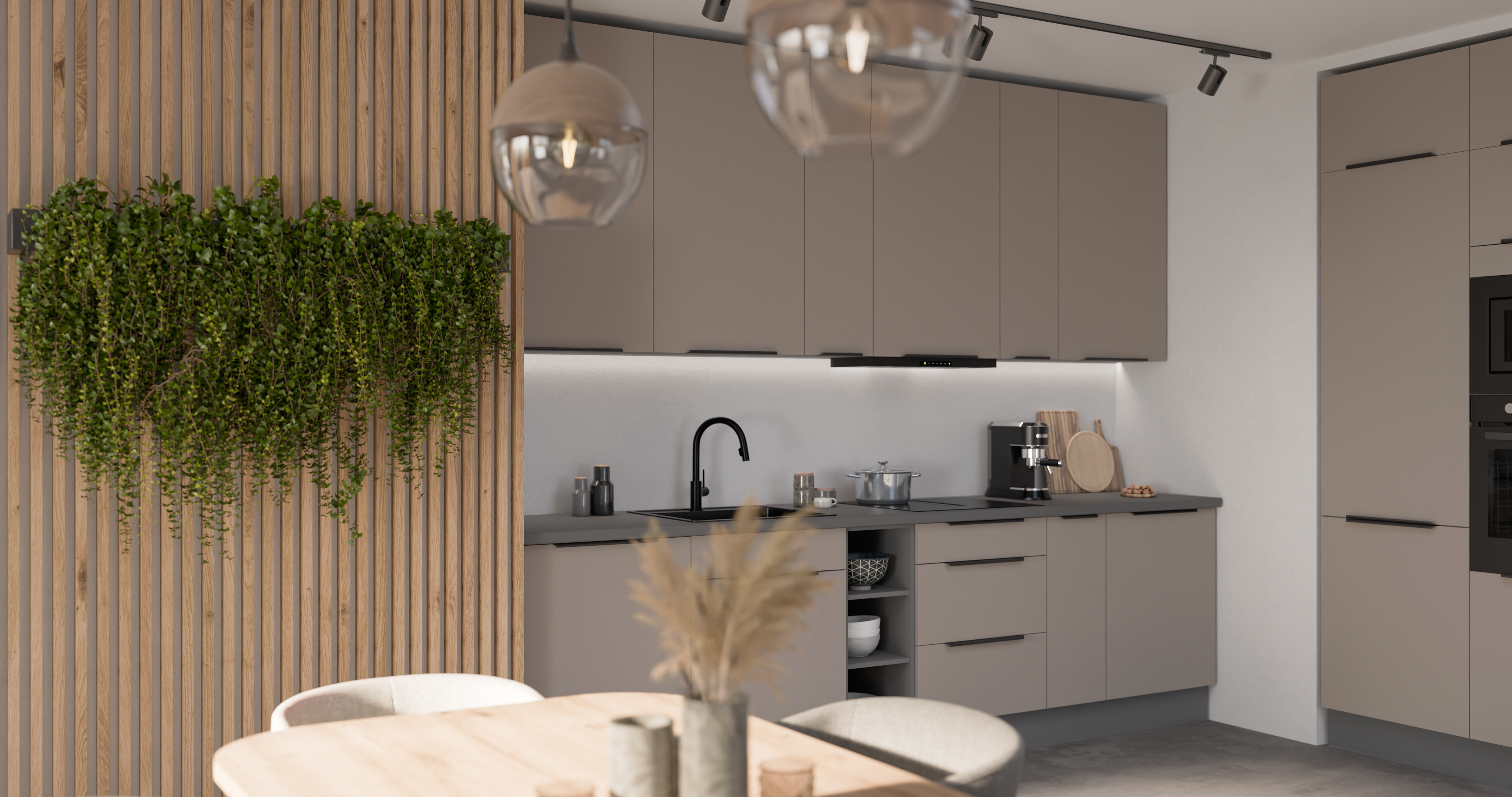 CALIA to nowoczesna kolekcja mebli kuchennych, łącząca styl, funkcjonalność i najwyższą jakość wykonania. Jej największym wyróżnikiem są fronty pokryte innowacyjną powłoką ANTI-FINGERPRINT, która skutecznie ogranicza powstawanie śladów palców. Dzięki niej powierzchnie mebli pozostają czyste i estetyczne na dłużej, a matowe wykończenie frontów nadaje im elegancki, nowoczesny charakter.