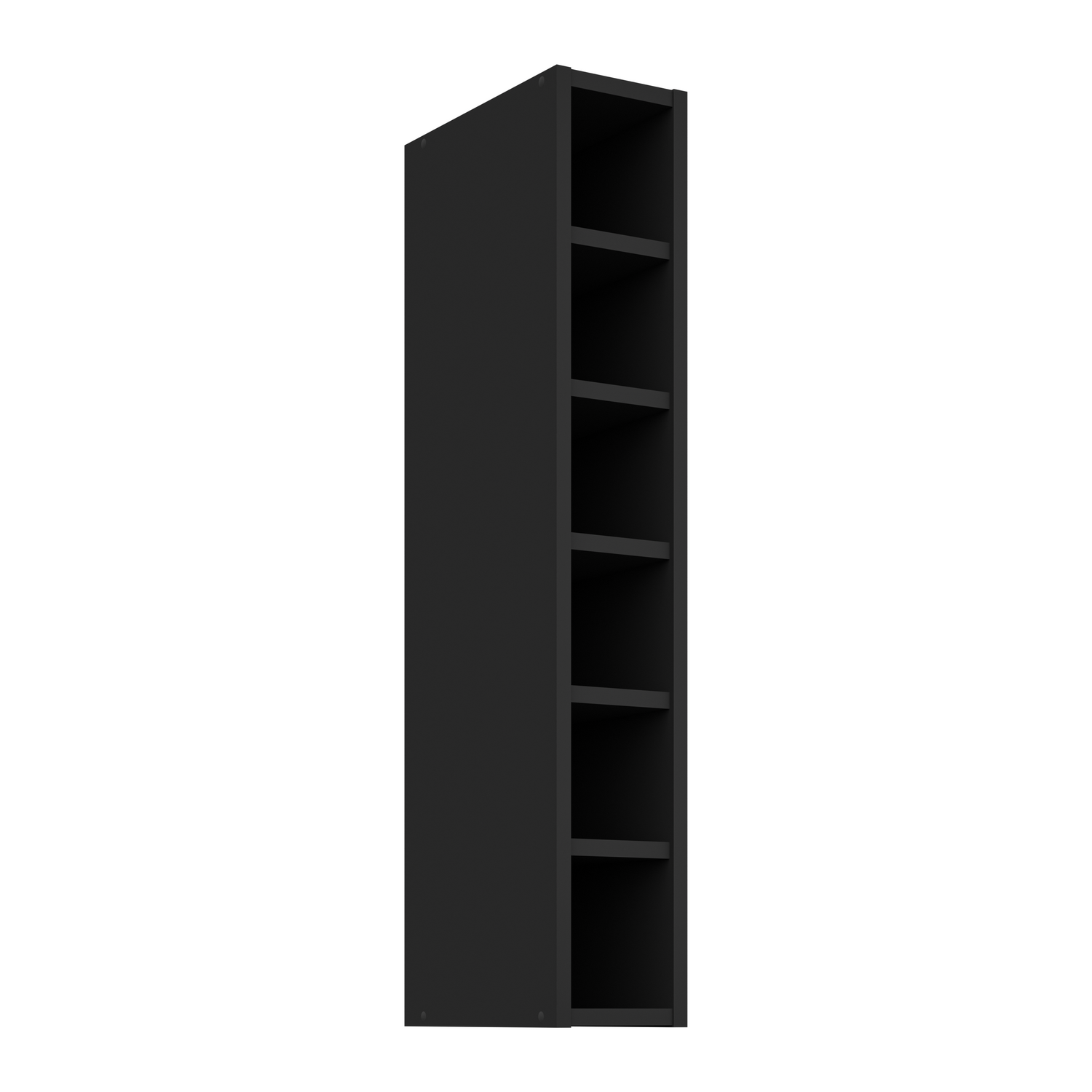 Szafka górna otwarta 15 G-90 1F OTW. - praktyczna propozycja dla nowoczesnych kuchni. Jej kompaktowa szerokość 15 cm i wysokość 90 cm sprawiają, że świetnie sprawdza się jako boczne zakończenie zabudowy lub uzupełnienie trudniej dostępnych przestrzeni. Trzy półki umożliwiają przechowywanie drobnych przedmiotów, takich jak przyprawy, małe słoiczki, kubki czy dekoracje. Matowe czarne wykończenie dodaje elegancji, a jednocześnie pozwala na łatwe zestawienie z innymi elementami kolekcji.