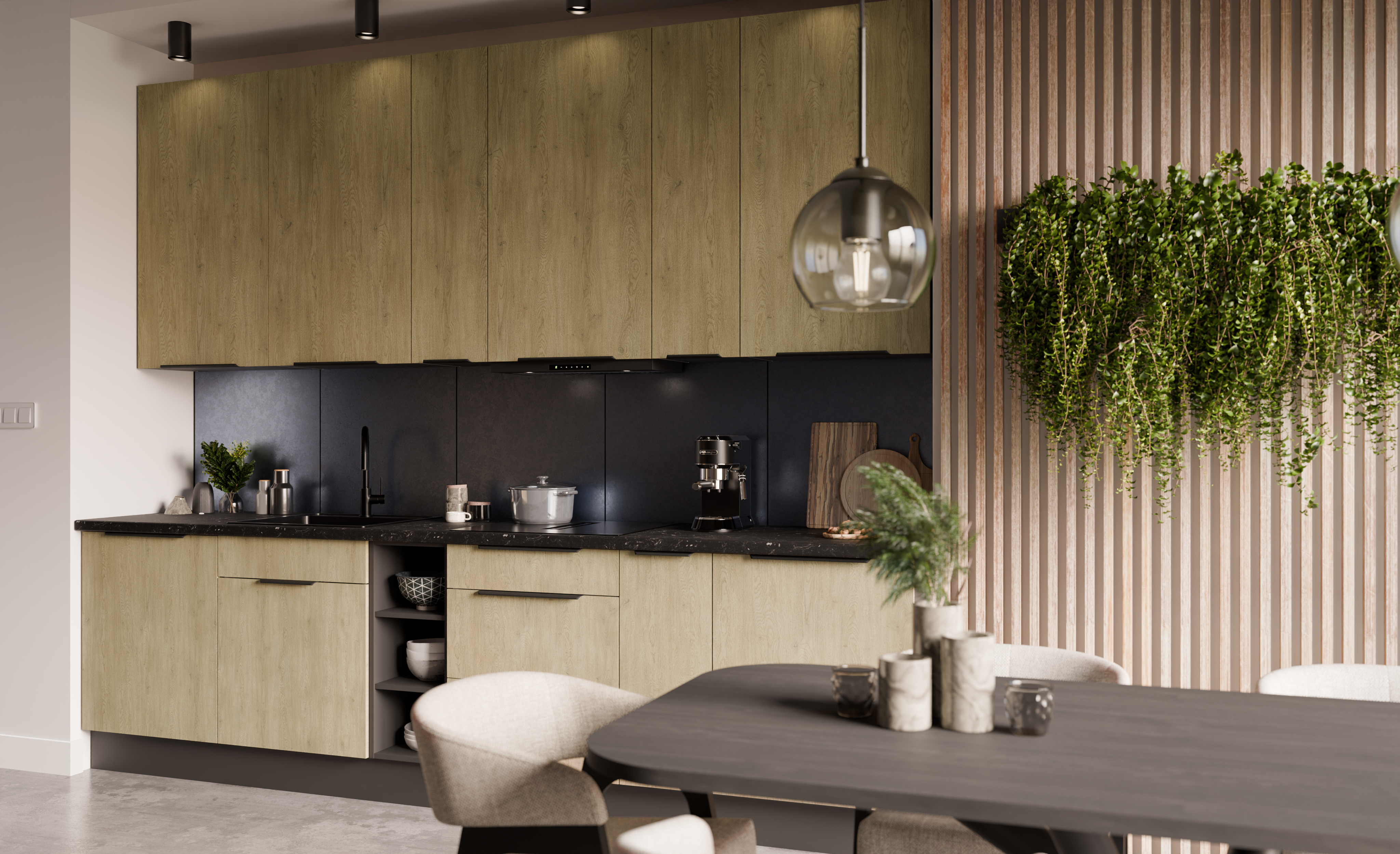 ☑️ Nowoczesny design – matowe fronty w kolorze Dąb Cremona w połączeniu z korpusem w kolorze antracytu i uchwytem krawędziowym UA-HEXA z aluminium tworzą wyrafinowany, a zarazem ponadczasowy wygląd.