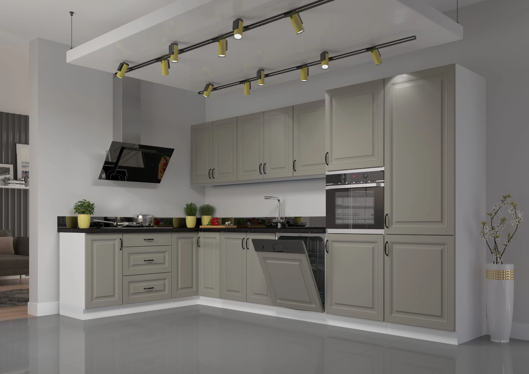 - Jasnoszare matowe fronty z frezami + korpus w kolorze białym