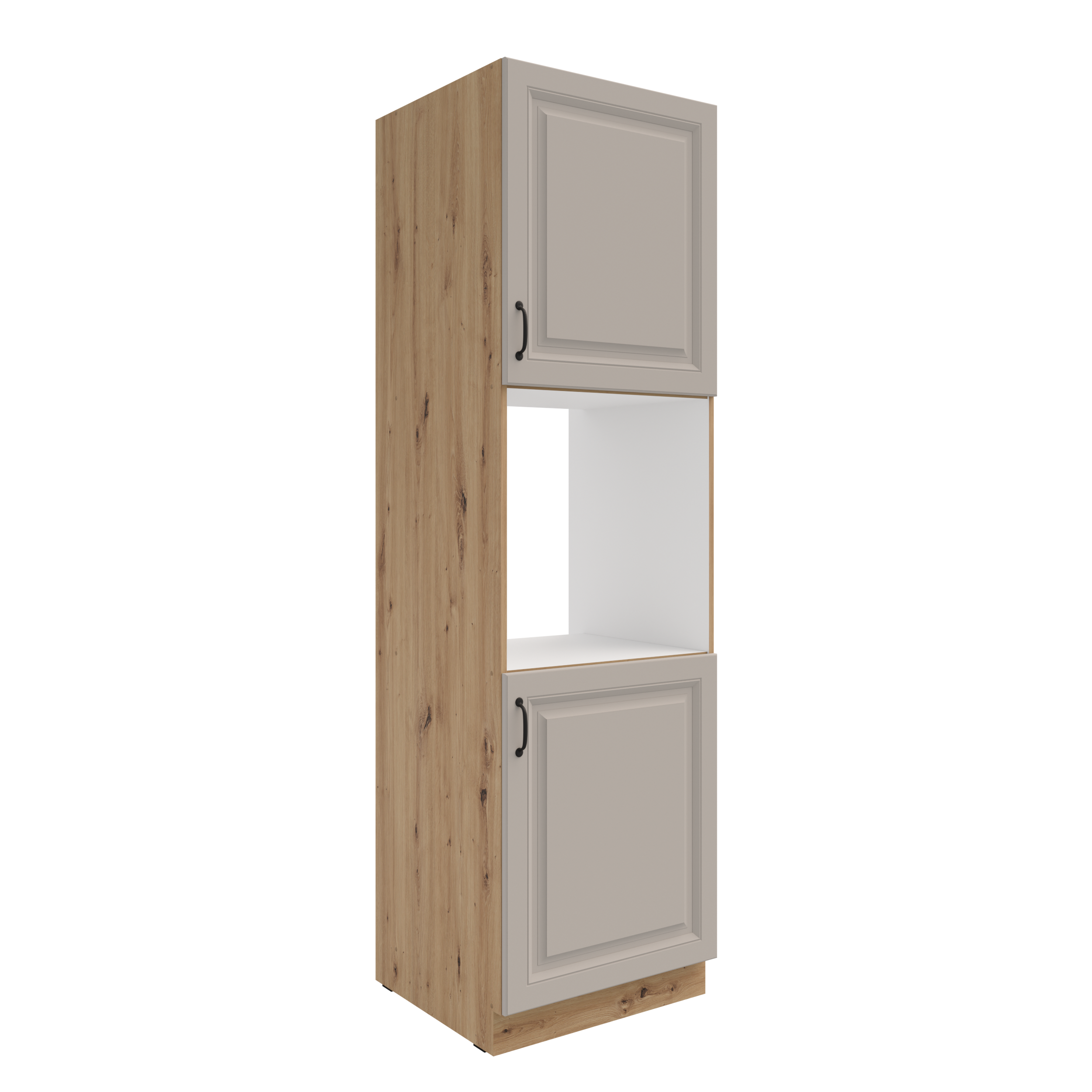 Szafka kuchenna 60 DP-210 2F z kolekcji ATENA to słupek przeznaczony do zabudowy piekarnika, który łączy nowoczesny design z praktyczną funkcjonalnością. Wyposażona w dwie strefy przechowywania z półkami oraz wnękę na piekarnik na ergonomicznej wysokości, pozwala wygodnie korzystać ze sprzętu, jednocześnie oferując miejsce na naczynia, formy lub zapasy. Matowe, jasnoszare fronty z dekoracyjnym frezowaniem i korpus w kolorze - dąb artisan, tworzą przytulną całość, doskonale wpisując się w spójną i estetyczną zabudowę kuchenną.