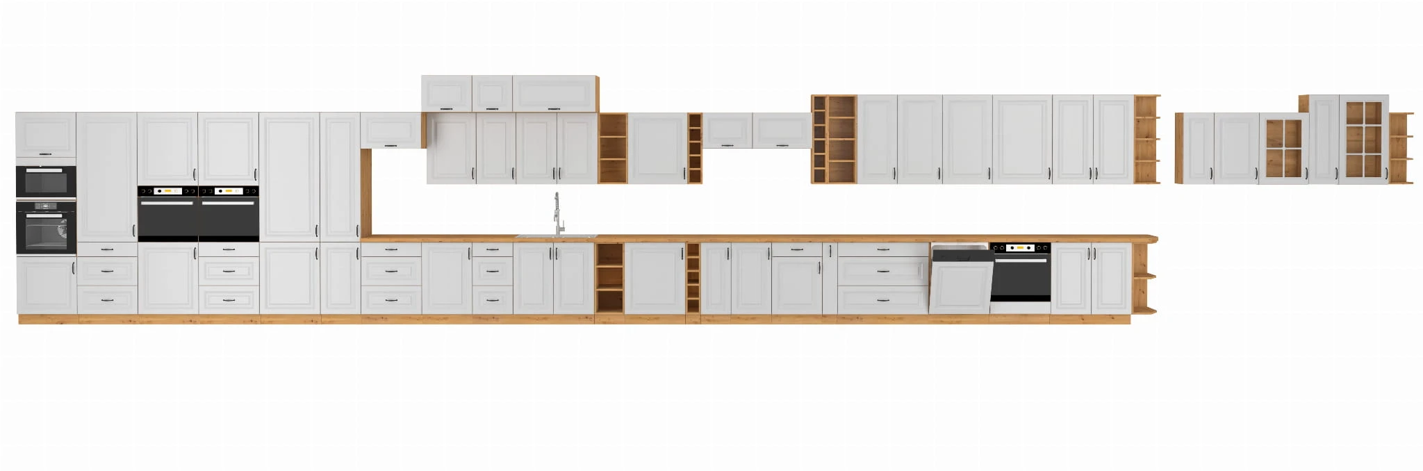 - Białe matowe fronty z frezami + korpus w kolorze dąb artisan