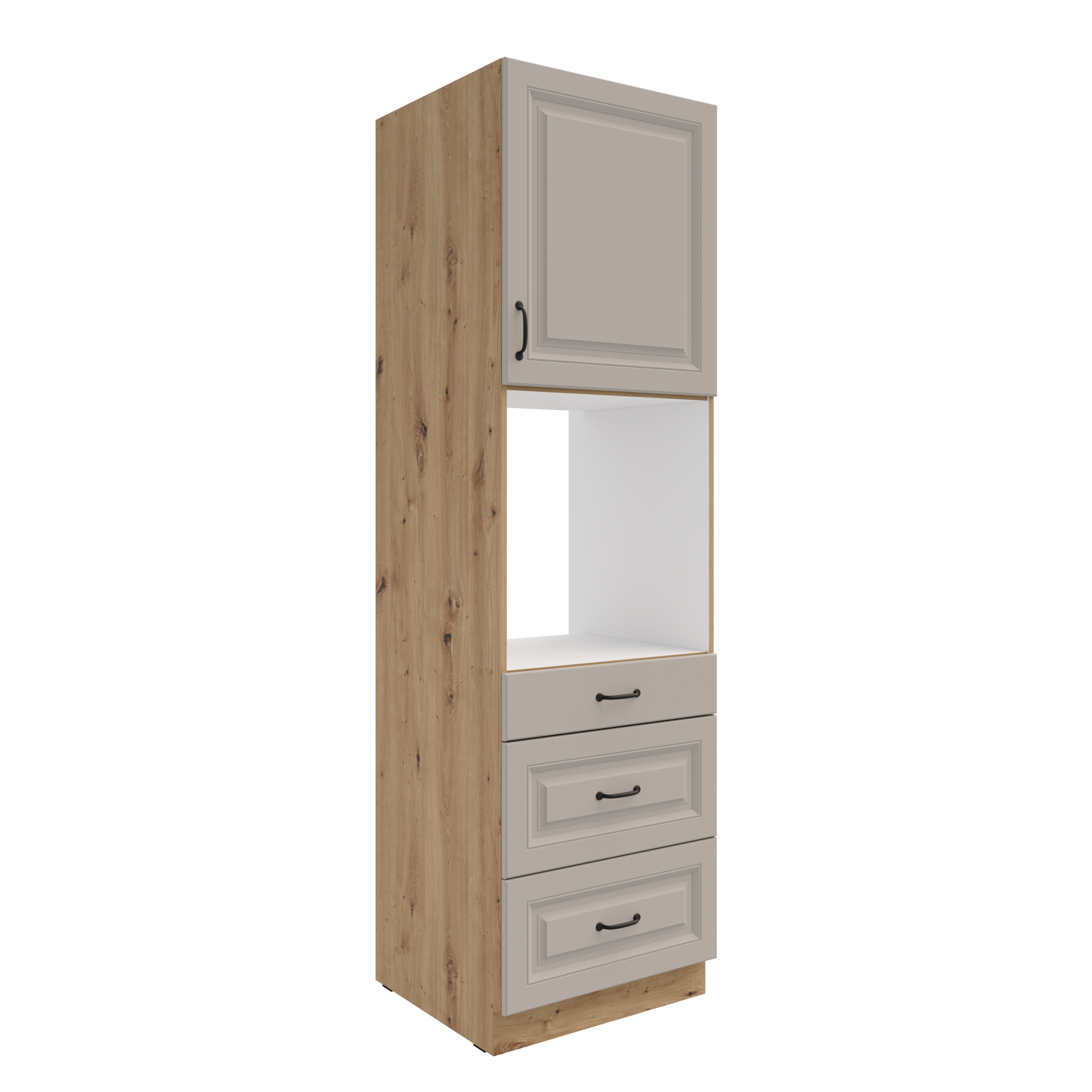 Słupek kuchenny 60 DPS-210 3S 1F z kolekcji ATENA to idealne rozwiązanie do zabudowy piekarnika, które dodatkowo oferuje praktyczną przestrzeń do przechowywania. Trzy dolne szuflady zapewniają łatwy dostęp do najczęściej używanych akcesoriów kuchennych, a górny front skrywa miejsce na drobne zapasy lub naczynia. Eleganckie frezowane fronty w jasnoszarym macie oraz kontrastujący korpus w kolorze dębu nadają szafce nowoczesny, ciepły charakter, idealnie wpasowując się w każdą aranżację kuchni.