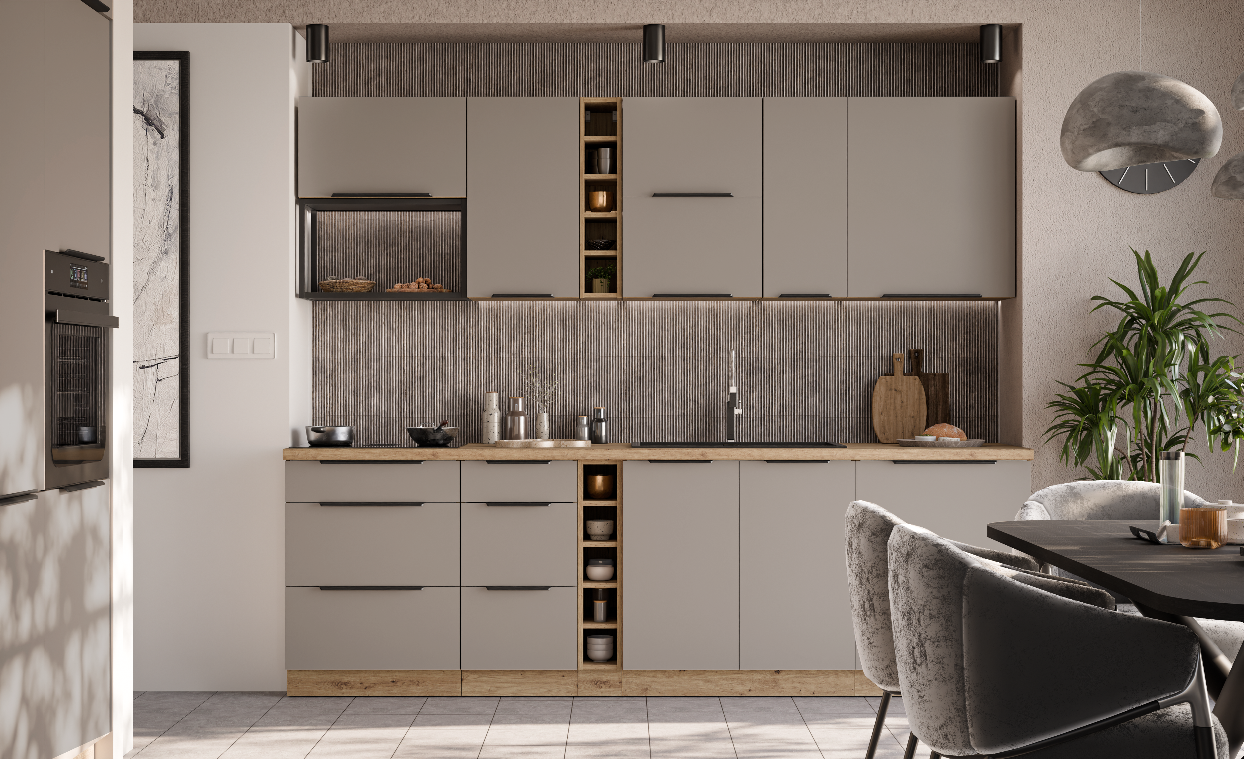 Szafki kuchenne z kolekcji CALIA zostały wyposażone w prowadnice PREMIUM BOX oraz system cichego domyku, które zapewniają komfort użytkowania i trwałość na lata. To kuchnia, która zachwyca wyglądem i pozostaje praktyczna każdego dnia.